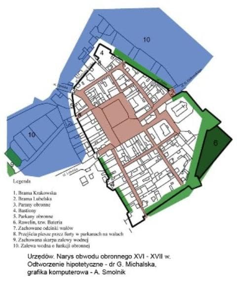 Na zewnątrz więc bramy Krakowskiej były zaraz bagna, przez które musiał być przerzucony most, niszczony w czasie napadu nieprzyjacielskiego (jest tu również most w czasach dzisiejszych). Identycznie było po stronie przeciwnej, tj północno-wschodniej, gdzie stała brama Lubelska. Trzecia była brama Opolska.