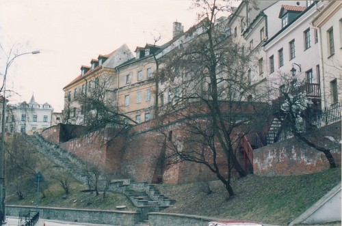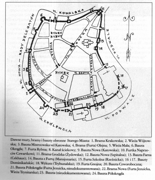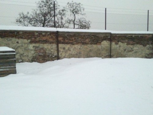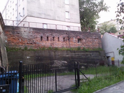 Mury od ul. Podwale Według planu centralnie na zdjęciu powinna być Baszta Nowa (Szpitalna) (nr 12 na planie)