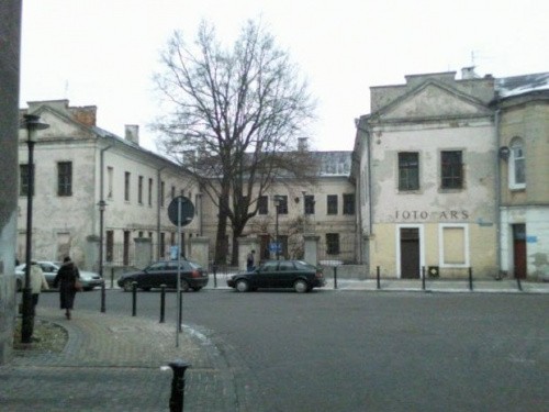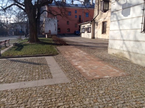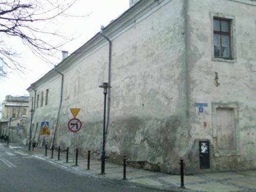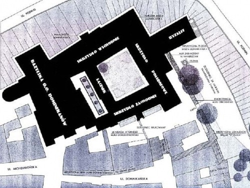 Zaznaczony przebieg muru obok klasztoru oo Dominikanów.