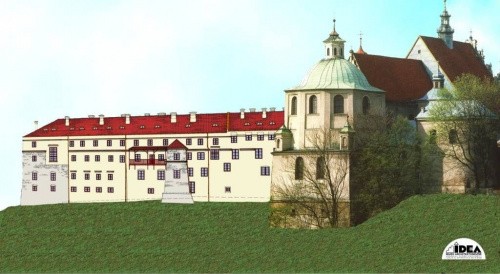 Amimacja klasztoru Dominikanów z zaznaczeniem pozostałości baszt w linii murów miejskich (szary kolor).