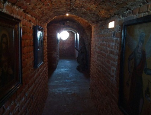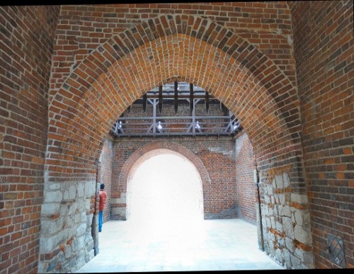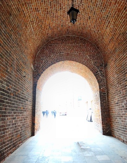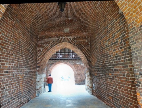 Brama Krakowska z nieco innej perspektywy. Udało się wejść na blanki przedbramia. Korytarz w grubości murów prowadzący na przedbramie. Około 1,6