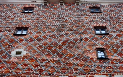 - Średniowieczne efekty ozdobne na elewacjach bramy - w dolnej części szachownica z białych kamieni i czerwonych cegieł, w górnej części - romby z ciemnych zendrówek.
