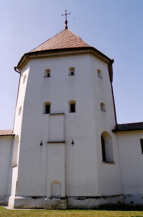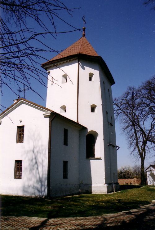 Ta wieża jest autentycznie obronna, zupełnie nietypowa jak na budowlę sakralną. W dodatku znajduje się w bardzo nietypowym miejscu - jest daje się nadbudowana nad trójbocznie zamkniętym chórem. Zatem wieża w istocie nie stoi przy kościele ale jest jego integralną częścią wznosząc się nad prezbiterium. Należałoby się zastanowić, czy mury kondygnacji drugiej ( wieżowej ) są równoczesne z parterem - częścią chórową i czy otwory strzelnicze są także równoczesne z budową samego chóru ( jeśli są to wówczas kościół od początku był obronny ) czy też oba elementy są wtórne i datują się okresu adaptacji pierwotnie nieobronnej świątyni do funkcji obronnej. Fakt, że wieża wyrasta ponad chórem wskazuje, że jeśli miała ona jakiś związek z jakimkolwiek świeckim dworem to całe prezbiterium zostało przekształcone z wieży dworskiej na część kościoła.