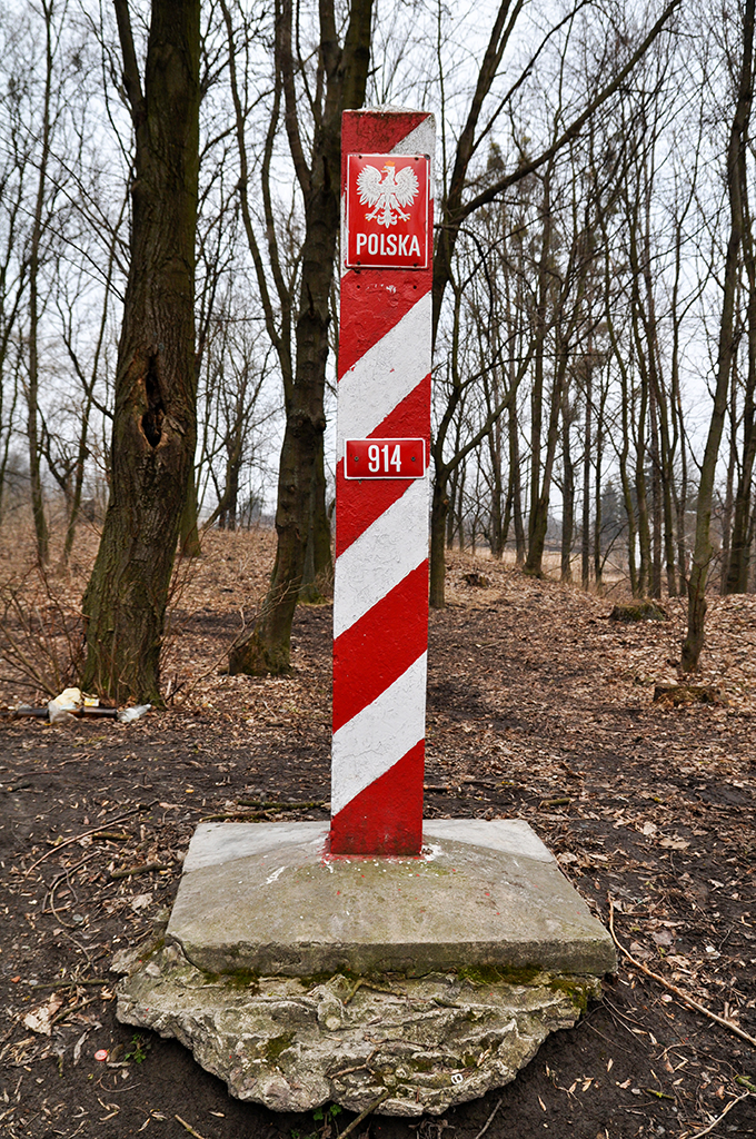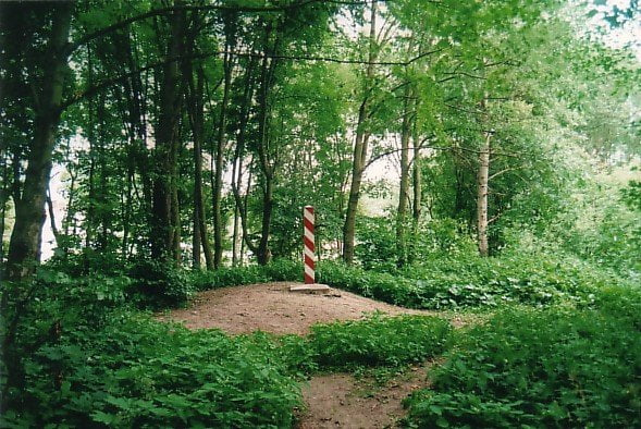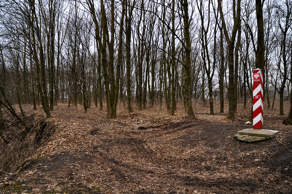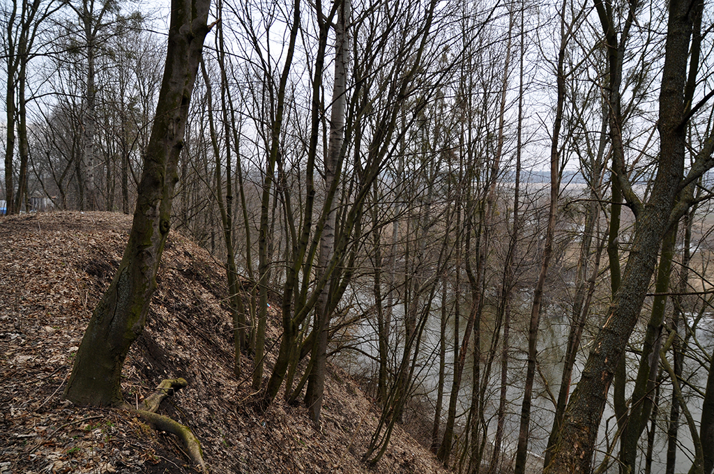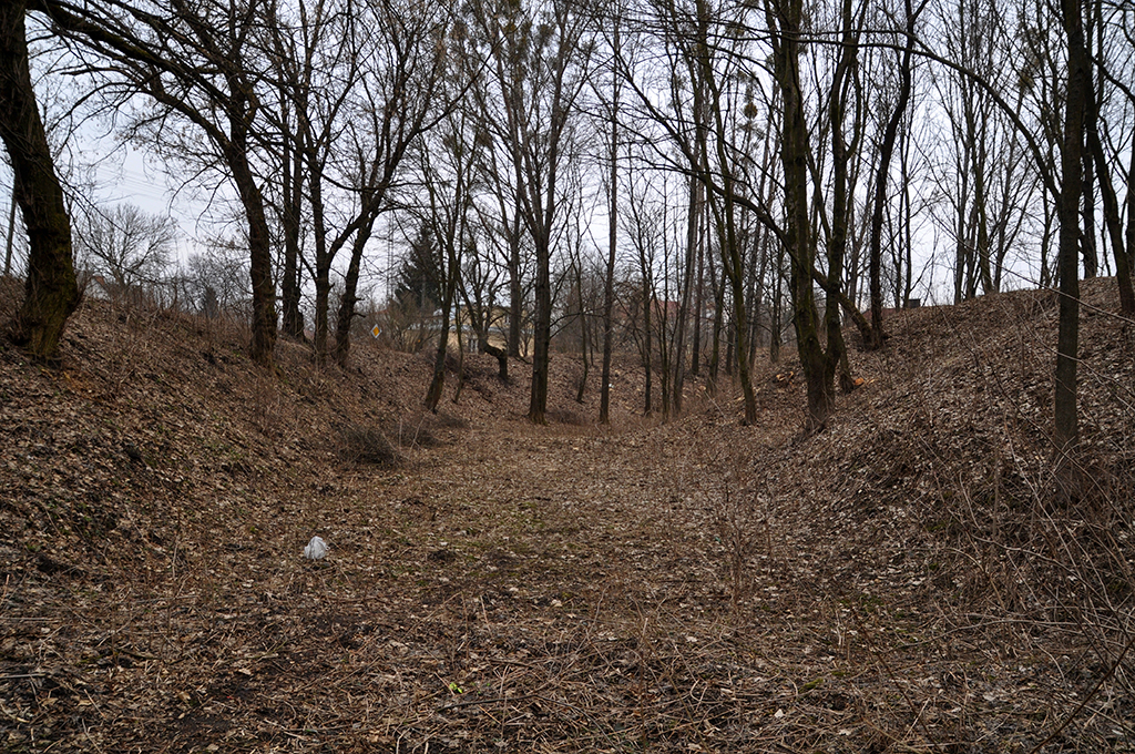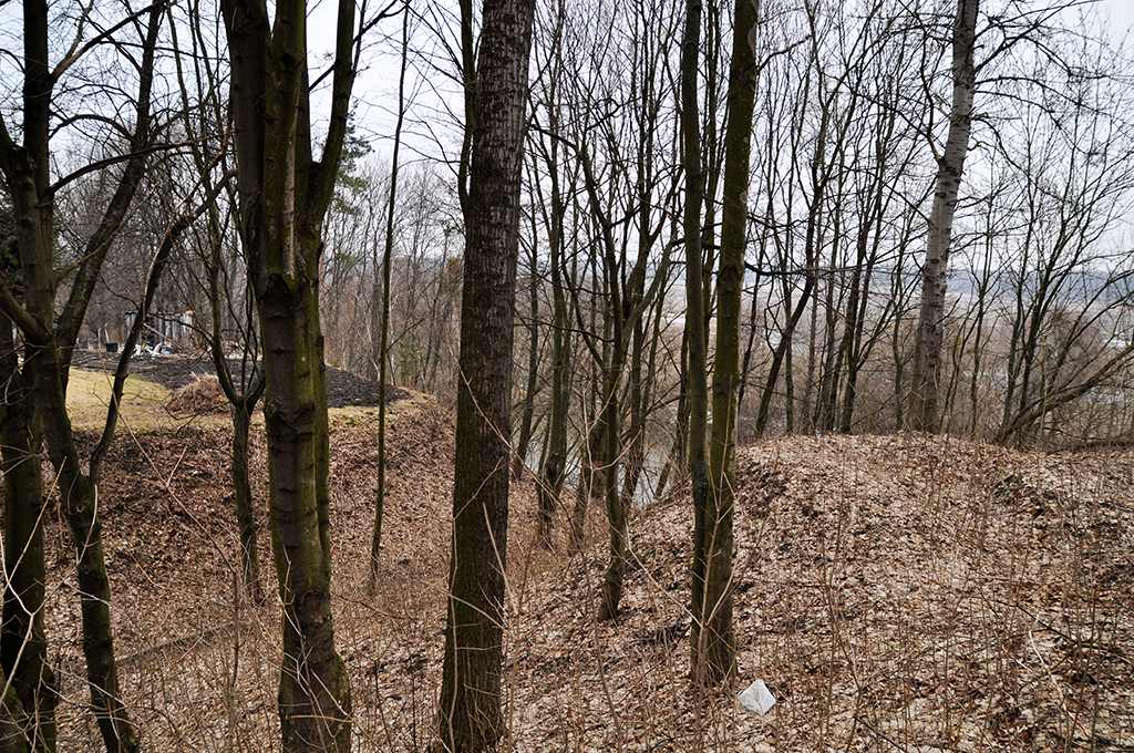 Zamczysko w Horodle, widać fosy, wzgórze oraz plateau na którym jest słup graniczny