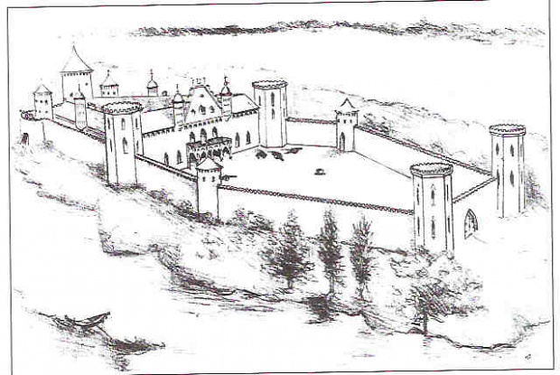 Reprodukcja rysunku z napisem: 'Zamek kryłowski rekonstrukcja wedle danych profesora. Z albumu inż Ostaszewskiego"