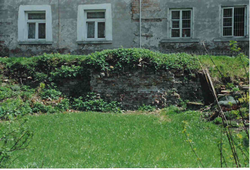 rekonstrukcja zamku/pałacu z początku istnienia, w obrębie umocnień miejskich widoczny jest mur z dwiema wieżami?