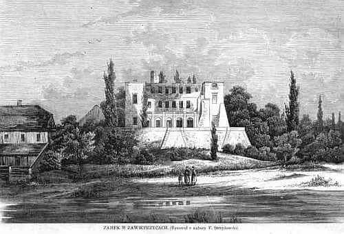zamek na drzeworycie F. Strzyżowskiego z 1862 roku. (źródło: http://www.ruinyizamki.forall.pl)