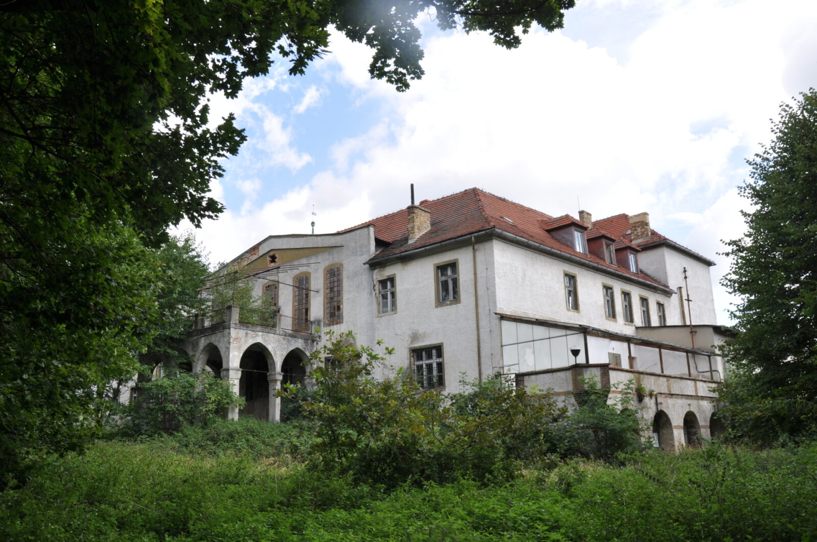 opuszczony, wejście na teren przez furtkę za kościołem