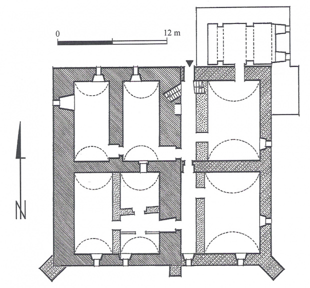 Plan dworu na poziomie piwnic wg. R.Kąsinowskiej 2003