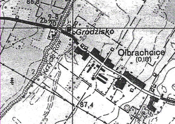 Gródek średniowieczny połozony jest przy północno zachodnim krańcu wsi po prawej stronie drogi z Góry Śląskiej do Wschowy, w podmokłej dolinie Krzyckiego Rowu. Pozostałości gródka zachowały się w postaci zniwelowanego częściowo nasypu otoczonego z trzech stron fosą. Z zachowanych część obiektu wnosić można, że wymiary nasypu pierwotnie wahały się u podstawy w granicach 30-36m natomiast górna płaszczyzna mogła mieć wielkość 15x17m. Obecnie na nasypie gródka stoi dom mieszkalny i zabudowania gospodarcze. Szerokość zachowanych odcinków fosy waha się w granicach 7-10m, głębokość 1,5m. Po jej zewnętrznej stronie zachowały się resztki wału ziemnego o szerokości do 3m i wysokości do 1m. W trakcie badań w 1982 roku pod warstwą próchnicy znaleziono ilasta ziemię z pozostałością gruzu ceglanego i zaprawy wapiennej. Obiekt w Olbrachcicach wzmiankowany jest kilkakrotnie w literaturze jako gródek średniowieczny.