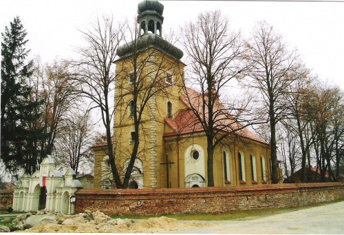 kościół św.św. Wojciecha i Stanisława B.M., fundowany w 1642 r. przez Stanisława Pstrokońskiego, biskupa chełmińskiego. Zbudowany na miejscu poprzedniego, który w dokumentach z początku XIV w. określony już był jako stary. Obecny kościół, pierwotnie jednonawowy, w 1917 r. rozbudowany o nawy boczne, jest bazyliką z węższym i niższym prezbiterium, zamkniętym półkolistą absydą. Od zach. 5-kondygnacyjna wieża. Sklepienie kolebkowe z lunetami, na gurtach o późnorenesansowej dekoracji stiukowej typu kalisko-lubelskiego. Z prezbiterium do zakrystii prowadzi wejście przez barokowy marmurowy portal z herbem Poraj i epitafium zmarłych członków rodziny Pstrokońskich w zwieńczeniu. W kaplicy Matki Bożej barokowy marmurowy portal, z tablicą erekcyjną kościoła z 1642 r. Ołtarze barokowe. Na belce tęczowej krucyfiks barokowy z XVIII w. Krata kuta żelazna z przełomu XVII i XVIII w. Misa chrzcielna gotycka z XV w. W archiwum kościelnym księgi chrztów od 1826 r. i ślubów od 1830 r. Cmentarz przykościelny otoczony jest murem o charakterze obronnym z wnękami od wewnątrz i otworami strzelniczymi o wykroju kluczowym.