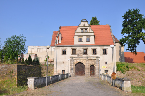 Najstarszą częścią zamku są relikty dworu czytelne w południowym skrzydle założenia. Stanowi je zachowany do poziomu parteru mur obwodowy zbudowany z kamienia i cegły na planie prostokąta o wymiarach 26x24,5m. Wschodnią część dziedzińca zajmował murowany trójkondygnacyjny budynek mieszkalny o wymiarach 26x14. Obiekt ten miał rozbudowane przyziemie z czterema pomieszczeniami krytymi kolebami. Na poziomie pierwszego piętra wnętrze podzielone było na trzy prawie identycznej wielkości pomieszczenia. Pierwotnie dwór miał być otoczony fosą, a wjazd na teren siedziby prowadził przez zwodzony most.