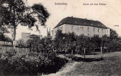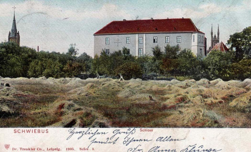 Kilka mniej więcej stuletnich pocztówek z widokiem z różnych stron na świebodziński zamek (zbiory własne).