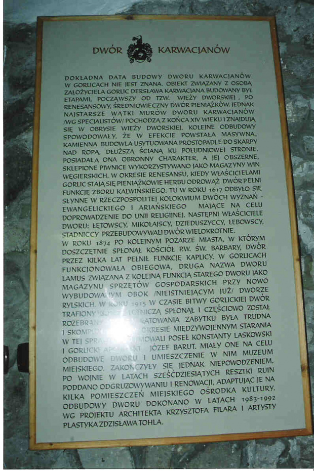 Pierwszą budowlę postawił w mieście Dersław I Karwacjan herbu Zadora w 1417 roku. Gorlice uzyskały wtedy prawa miejskie i potrzebny był dwór, funkcjonujący jako centrum władzy. Po budowli tej pozostały jednak tylko wspomnienia i fragmenty murów w piwnicach. Za życia Jana Karwacjana, czyli w początkach XVI wieku, do dworu dobudowano kwadratową wieżę. Prawdziwie renesansowe kształty budynek uzyskał dopiero pod koniec XVI wieku, kiedy to Gorlice przeszły na własność Pieniążków herbu Odrowąż. Byli oni protestantami, a budynek dworu doskonale nadawał się na zbór i jako taki właśnie funkcjonował do końca XVI wieku. Kolejny właściciel, Stanisław Łętowski, przywrócił obiektowi funkcje mieszkalne, zachowując jednak obronny charakter całości. Używał dworu dość krótko, w połowie XVII wieku wyprowadził się do "dworu polskiego" pozostawiając dwór obronny na łasce natury. Budynek szybko więc niszczał, używano go zamiennie jako lamusa i spichlerza. Działania wojenne w 1915 roku zniosły dwór z powierzchni ziemi (wraz z większą częścią Gorlic). Jako ruina przetrwał do 1992 roku, w którym to został odbudowany w renesansowym kształcie. Obecnie mieści się w nim Biuro Wystaw Artystycznych.