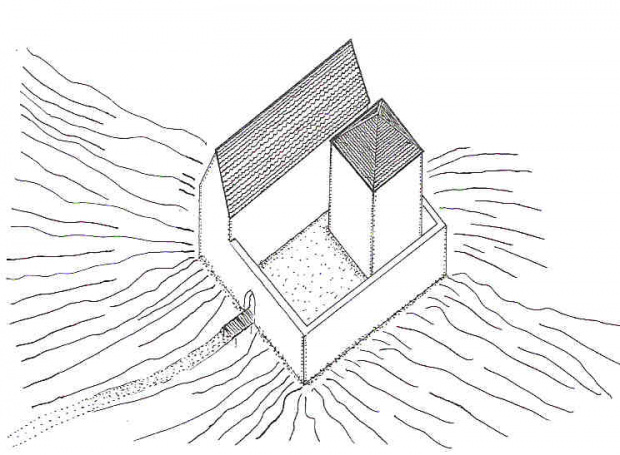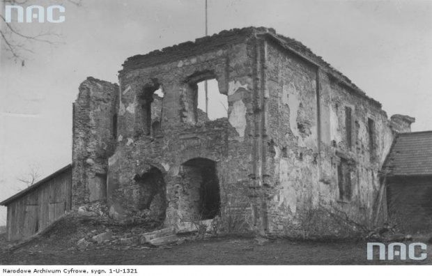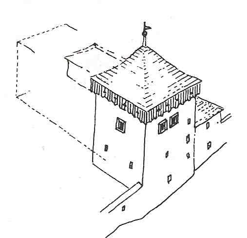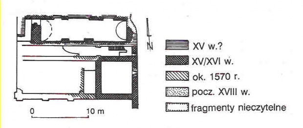 Wieża mieszkalna z XV wieku, za wieżą budynek w obrębie murów obecnej piwnicy. Na lewo kreskowaną linią podano zarys bryły dworu z II połowy XVI wieku, wg.J.Bogdanowskiego