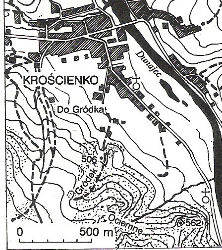 Stanowisko położone jest na południe od Krościenka, na stożkowatym wzgórzu "Gródek", 506m.n.p.m. Nazwa wzgórza oraz istnienie w okolicy terenowej nazwy "Do Gródka" zwróciły uwagę archeologów. Ponadto kształt wzgórza sugerował istnienie tu gródka typu stożkowatego. podjęte badania sondażowe (M.Cabalska-1976) nie ujawniły jednak śladów warstwy kulturowej ani zabytków ruchomych, datowanych na okres średniowiecza. istnieją podejrzenia, że najwyższe warstwy mogły spłynąć po stromych zboczach, a zatem śladów ewentualnego obiektu należy szukać w w rynnach i faldach terenowych poniżej kulminacji. W trakcie przeprowadzonych w dolnych partiach wzgórza badań powierzchniowych (S.Kołodziejski) odkryto jednak tylko niecharakterystyczne fragmenty naczyń.