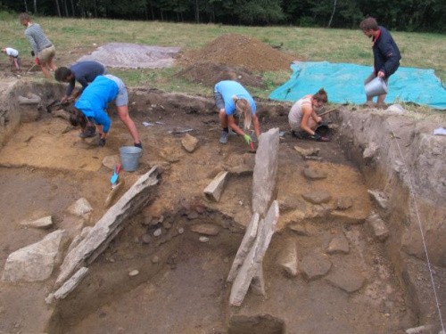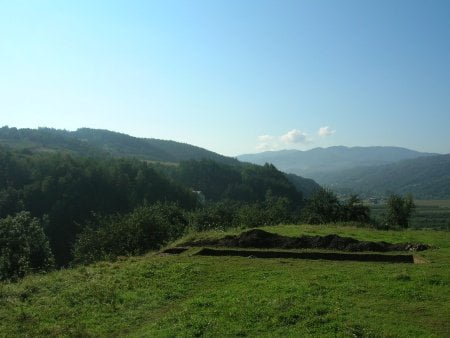 Jeden z wykopów badanych w sezonie 2010. W tle widok rozpościerający się ze stanowiska w kierunku południowym. Fot. A. Vitoš.