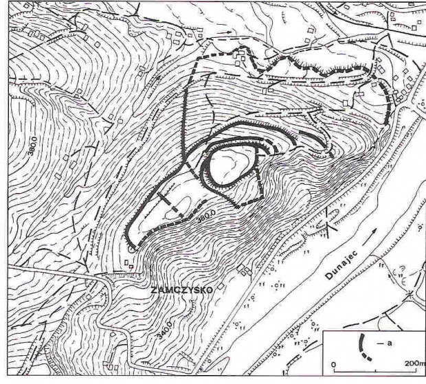 położenie grodziska, a- pewny i rekonstruowany przebieg wałów