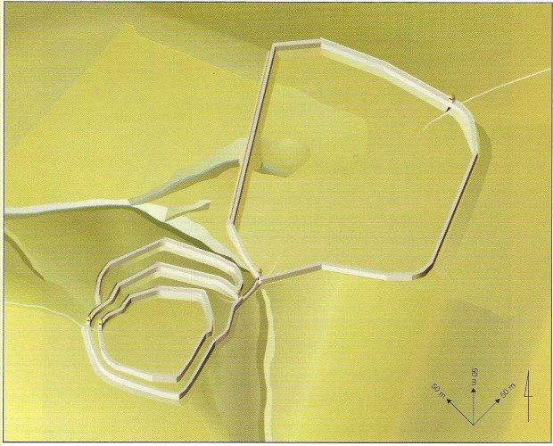 plan głównego trzonu grodziska, 1.wykopy archeologiczne, 2.przebieg wału 5 i 6 fazy osadniczej, 3. przebieg wałów 7 fazy osadniczej - średniowiecznej. Linie przerywane oznaczają rekonstruowany lub domniemany przebieg wału