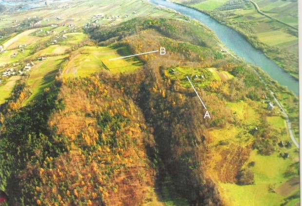 zdjęcie lotnicze grodziska, a-główny człon grodziska, b-podgrodzie "Mieścisko"