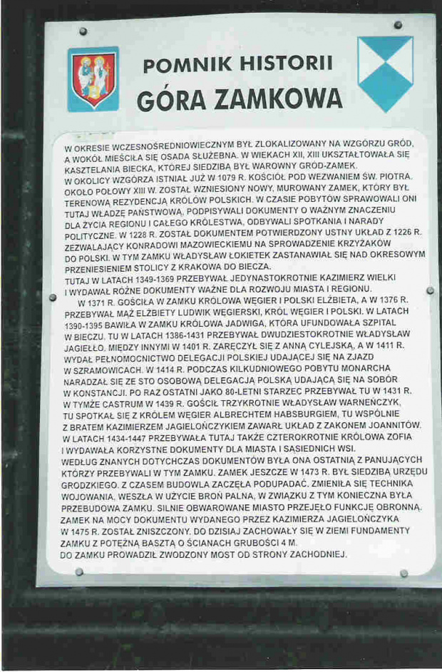 Na wzgórzu, na miejscu wczesnośredniowiecznego grodu wybudowano w XIII w. murowany zamek obronny, który był terenową siedzibą książąt i królów polskich. Cała powierzchnia wzgórza była otoczona murem obronnym. Od północy potężna baszta strzegła bramy i mostu. Cały dziedziniec zbliżony był do idealnego prostokąta. Od południa wzgórze obmywała rzeka Ropa. Zamek ostatecznie przestał pełnić funkcję obronną w 2 poł. XV w.. W 1475 r. Kazimierz IV Jagiellończyk polecił rozebrać zamek. Ruiny zamku i całej fortyfikacji istniały jeszcze w XIX w. Dzisiaj o istnieniu zamku świadczą tylko fundamenty zachowane w ziemi.