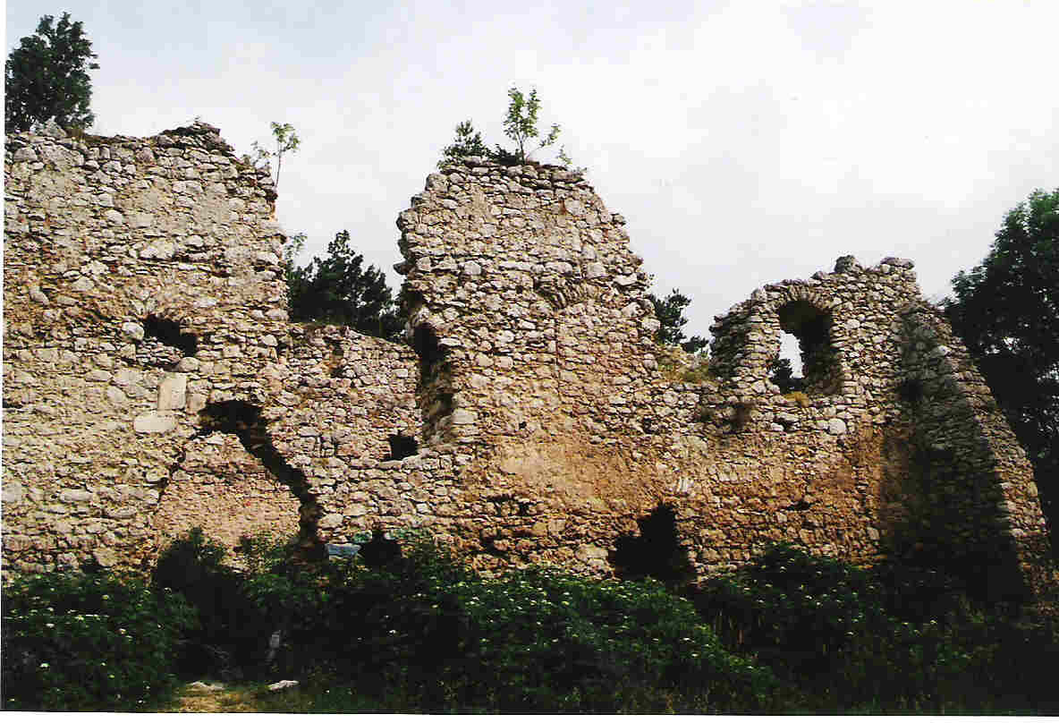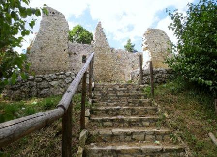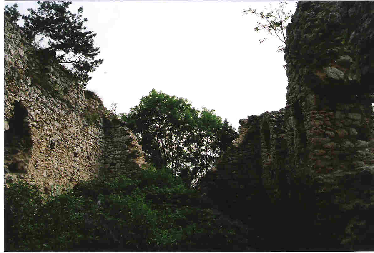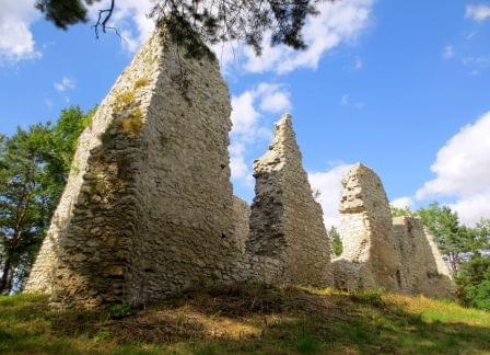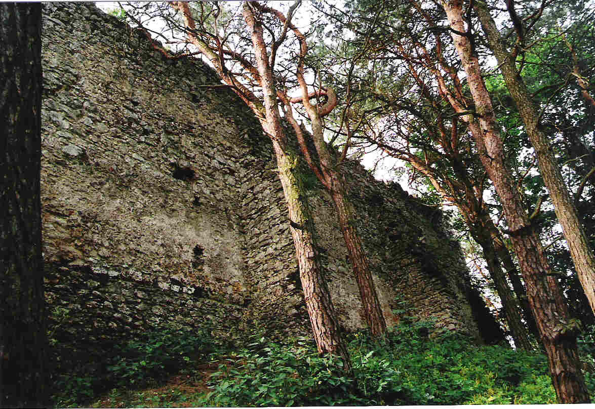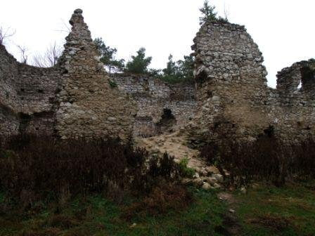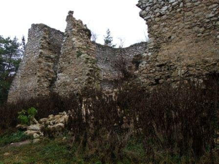 Widok ruin po odbudowie. Trzeba przyznać, że bezpośrednie sąsiedztwo ruin i ich wnętrze zostały wyczyszczone z chaszczy, nadbudowano murki, zaakcentowano mur obwodowy. Na ostatnim zdjęciu widać jednak skutki działalności miejscowych bobrów. Na lewo balustrada jest, na prawo już jej nie ma...(fot. lipiec 2015)