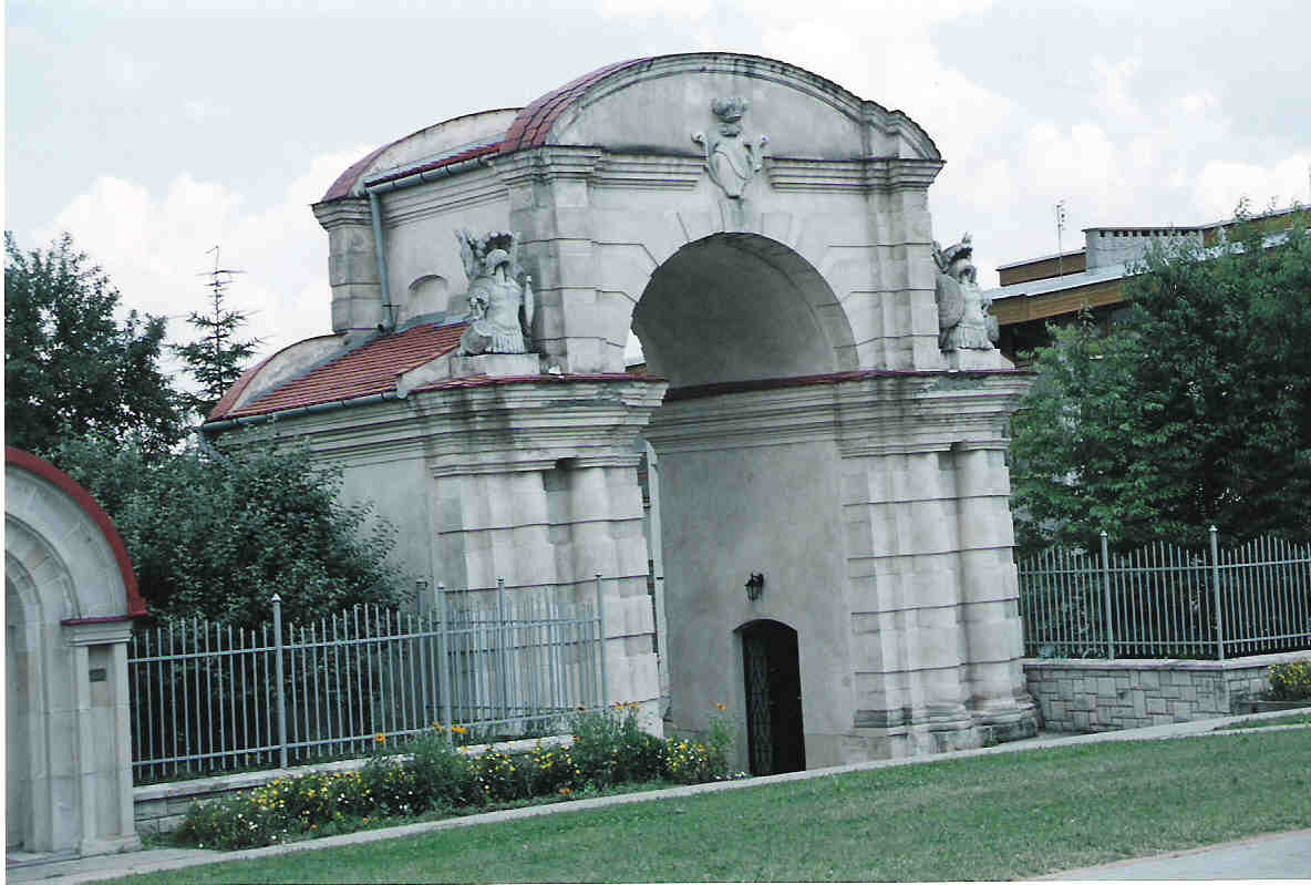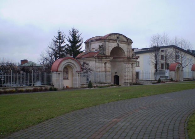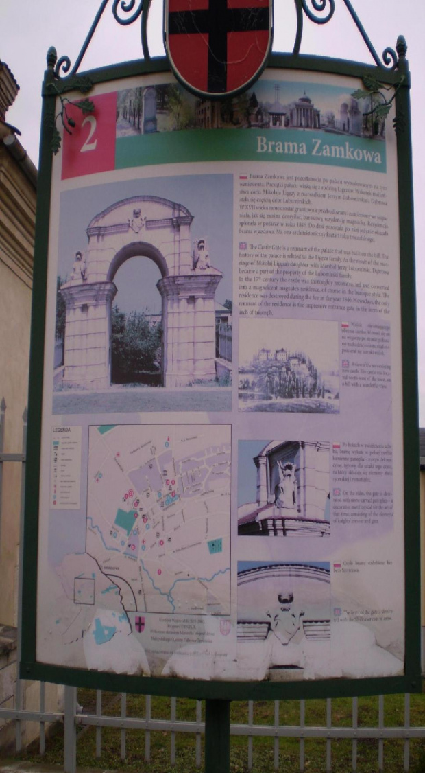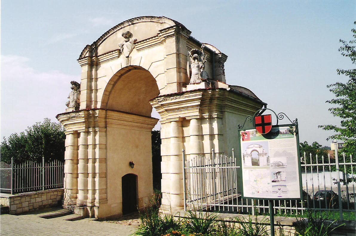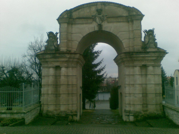 Brama pozamkowa z kolejnego ujęcia oraz kościół stojący w miejscu gdzie stał zamek