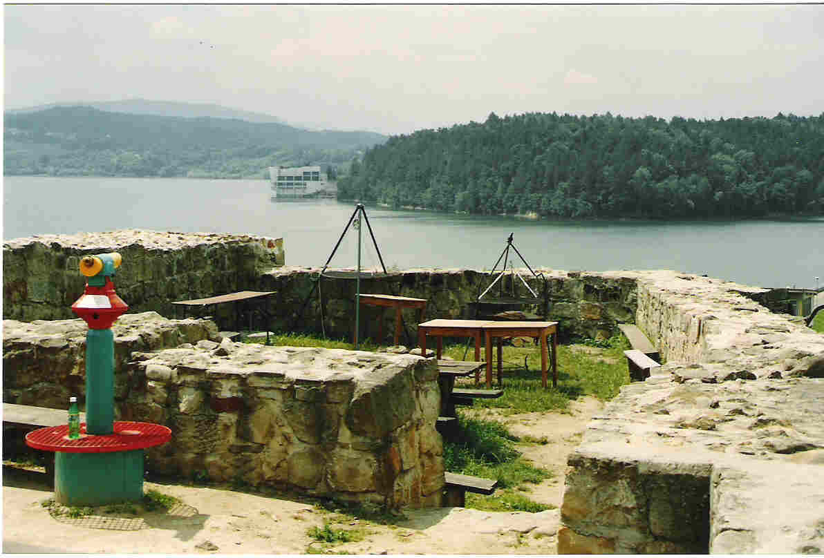 Zamek widziany z zapory w 2000, kiedy można było podejść na zaporę aż do budki „sterówki”. Teraz cała tama jest zamknięta, choć co wzbudziło moje pozytywne zaskoczenie, pootwierano bramki na u. Budowlańców, w związku z czym pieszo albo na rowerze można w normalny sposób dostać się pod bramę na tamie.