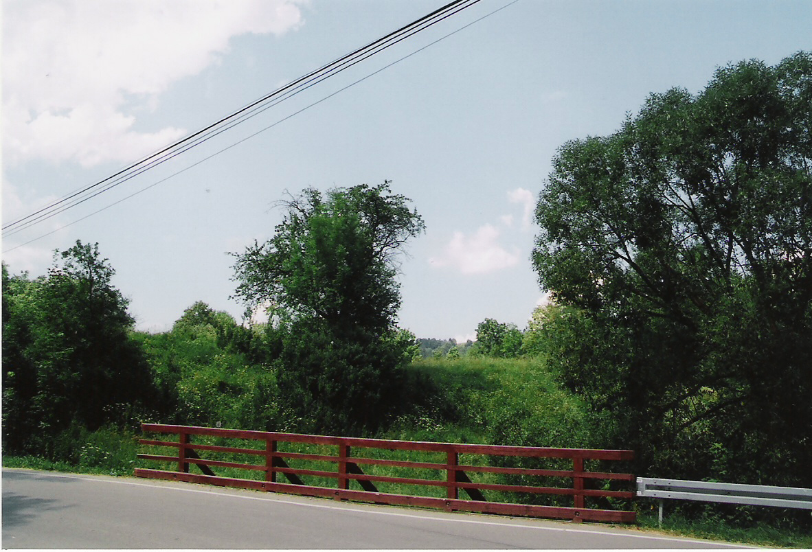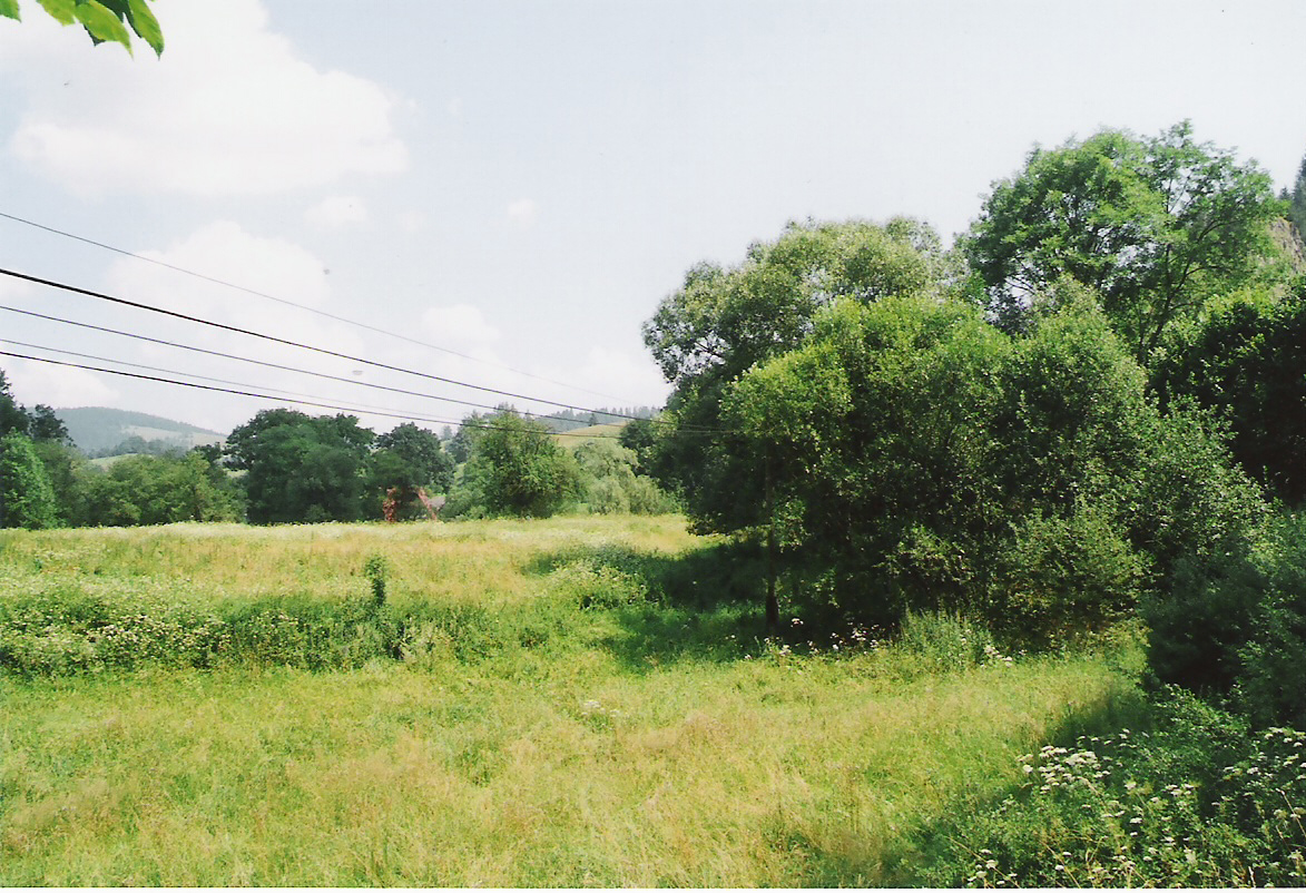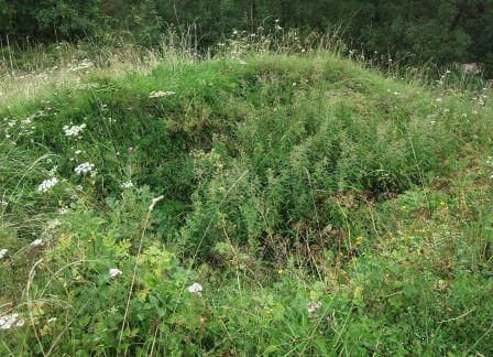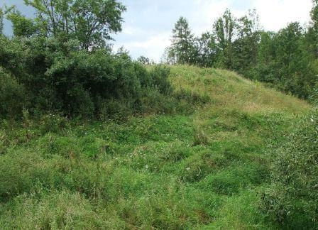 Widok na zamczysko od strony potoku i zapadlisko po wieży/bramie (fot. lipiec 2011).