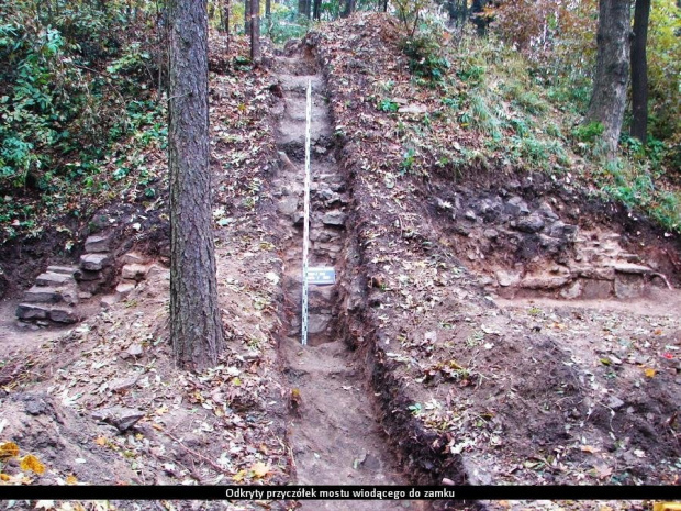 Na terenie tzw. gródka, usytuowanego na majdanie i skłonie stoku wzgórza odkryto dobrze zachowane relikty obwałowania drewniano-ziemnego, datowanego wstępnie najpóźniej na wiek XV. Były to pionowe i poziome belki konstrukcji skrzyniowej, wypełnionej rumoszem skały łupkowej. Konstrukcja ta uległa częściowemu spaleniu. Liczny materiał ruchomy, znaleziony podczas wykopalisk, w postaci fragmentów ceramiki, pochodzi głównie z wieku XIV i XV. Znaleziono jednak także pokaźny zespół ceramiki datowanej na okres wczesnego średniowiecza (XII i XIII wiek), czyli z czasu przed wybudowaniem zamku przez króla Kazimierza Wielkiego. Odkrycie to potwierdza domniemanie badaczy o istnieniu tu wczesnośredniowiecznego gródka strażniczego, którego załoga sprawowała nadzór nad odcinkiem pobliskiego traktu handlowego.