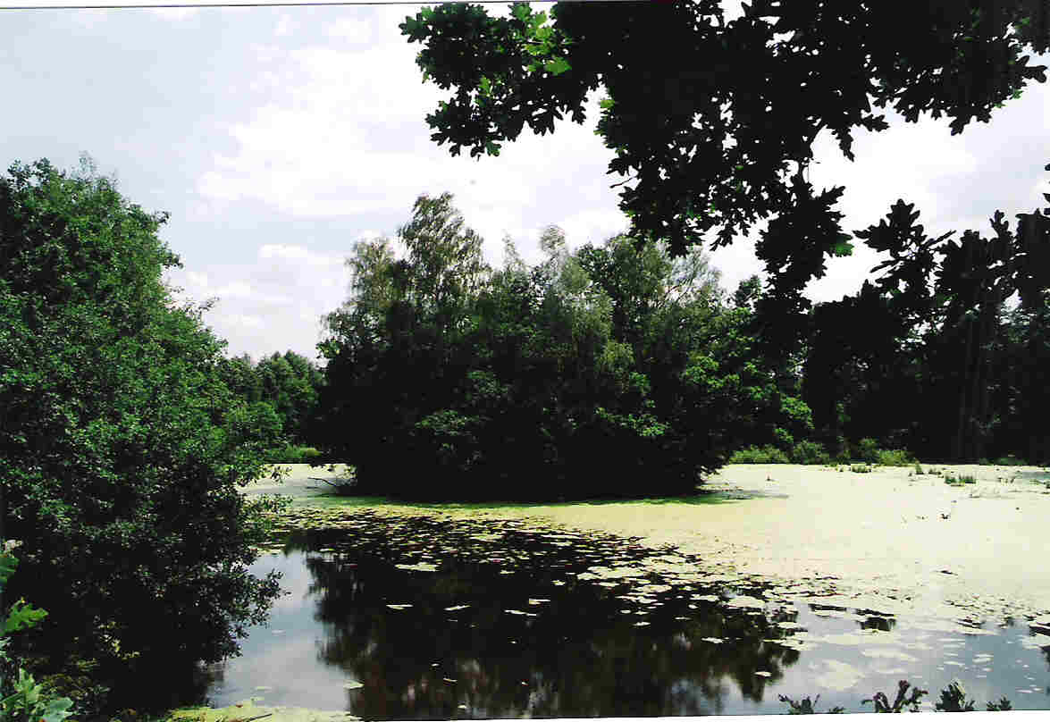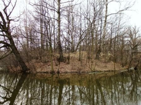 Sposób dotarcia: Auto zostawiamy przy sklepie obok skrzyżowania i obchodzimy dookoła PGR przy którym jest staw. Przy dwóch drzewach nad stawem postawiono drabiny, dzięki czemu po wspięciu się na nie uzyskujemy widok „z góry” na założenie. Fot. kwiecień 2011r.