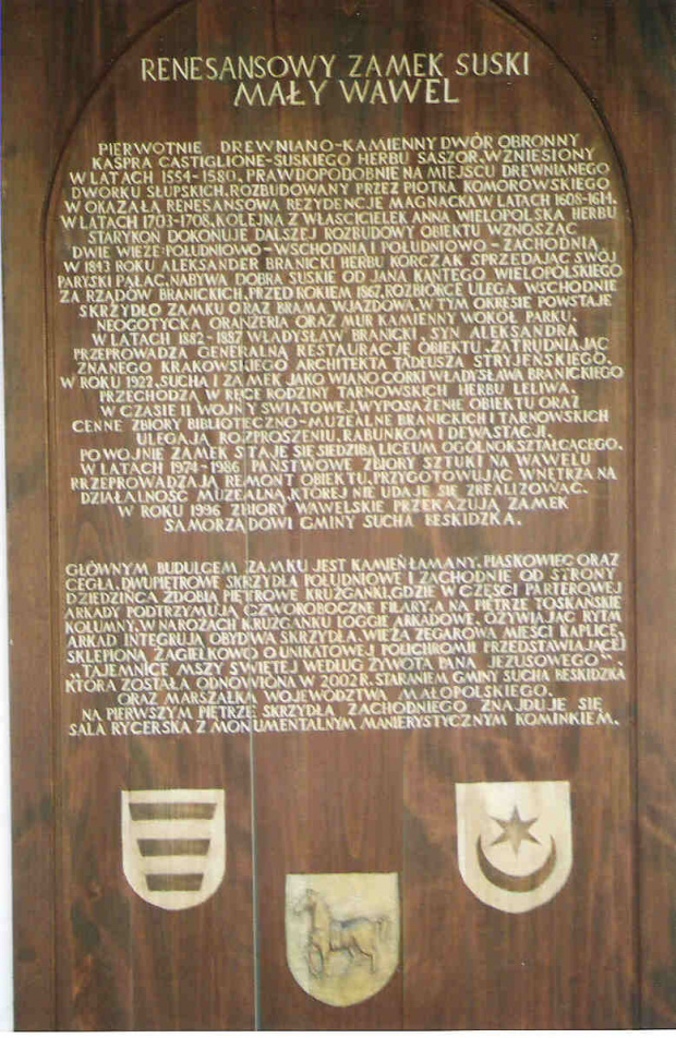 Pierwotnie drewniano - kamienny dwór obronny Kaspra Suskiego herbu Saszor, wzniesiony w latach 1554 - 1580, prawdopodobnie na miejscu drewnianego dworku Słupskich, który spłonął doszczętnie. Rozbudowany przez Piotra Komorowskiego w okazałą renesansową rezydencję magnacką w latach 1608 - 1614. W latach 1703 - 1708 Anna Wielopolska herbu Starykoń dokonała dalszej rozbudowy zamku wznosząc dwie wieże: południowo- wschodnią i południowo- zachodnią. W 1843 roku Aleksander Branicki herbu Korczak, sprzedając swój paryski pałac, nabywa Suchą od Jana Kantego Wielopolskiego. Za rządów Branickich, przed rokiem 1867, rozebrano skrzydło wschodnie zamku z bramą wjazdową. W tym też czasie powstała neogotycka oranżeria oraz mur kamienny wokół parku. W latach 1882 - 1887 Władysław Branicki podjął generalną restaurację zamku, zatrudniając architekta Tadeusza Stryjeńskiego. Prace budowlane prowadził niejaki Knaus z Płazy. W tym czasie powstały stiukowe obramienia okien elewacji parkowej i obu wież (dzieło włoskich sztukatorów) oraz wszystkie stropy o konstrukcji stalowej. Po pożarze w 1905 roku nastąpiła kolejna odbudowa zamku, którą również nadzorował Tadeusz Stryjeński. W roku 1922 Sucha i zamek jako wiano córki Władysława Branickiego przeszły w ręce rodziny Tarnowskich herbu Leliwa. W czasie II wojny światowej Zamek zajęli Niemcy, a później wojska radzieckie. Cenne zbiory biblioteczno - muzealne uległy rozproszeniu, rabunkom i dewastacji. Po wojnie w zamku mieściło się Liceum Ogólnokształcące, internat oraz magazyny GS i prywatni lokatorzy. W latach 1968 - 1986 Państwowe Zbiory Sztuki na Wawelu rozpoczęły prace renowacyjne w celu przygotowania obiektu na cele muzealne. W roku 1996 kompleks zamkowy został przejęty przez samorząd lokalny.(źr: http://www.sucha-beskidzka.pl)