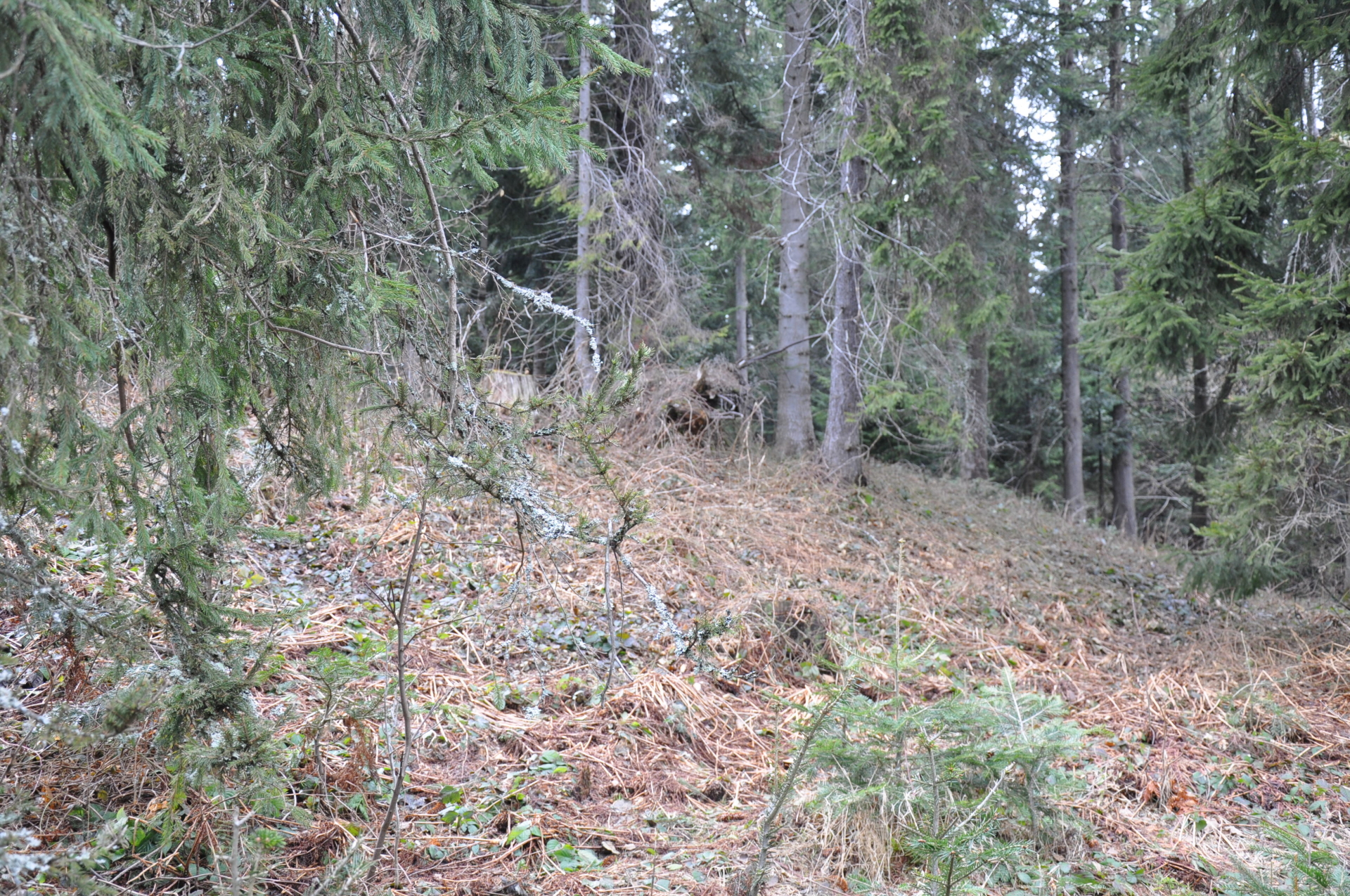 Na zdjęciu poniżej zbocze wału przy drodze po prawej stronie, w terenie jest to dość wyraźne wyniesienie, a zbocze jak widać na zdjęciu ma dość równomierną i regularną postać