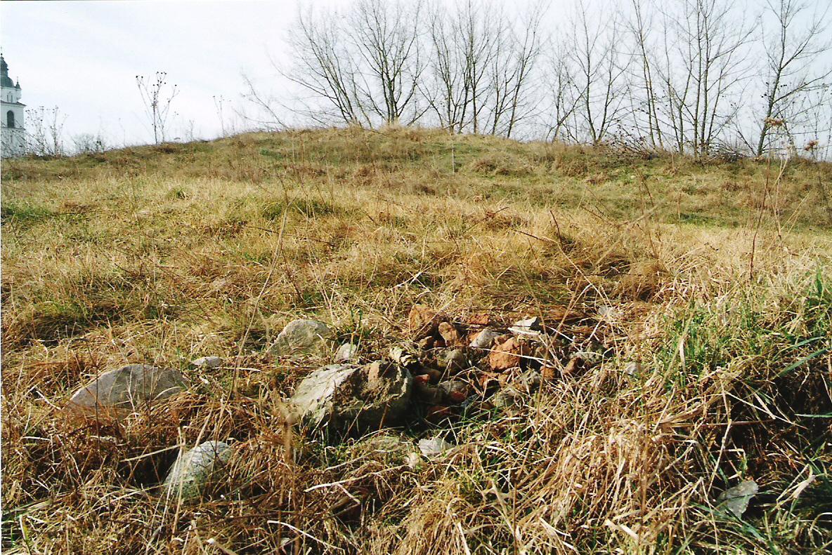 kopiec po dworze, obecnie mocno zniwelowany, zostało po nim około 40% pierwotnego założenia, na drugim zdjęciu pozostałości gruzu ceglanego znalezione na na kopcu