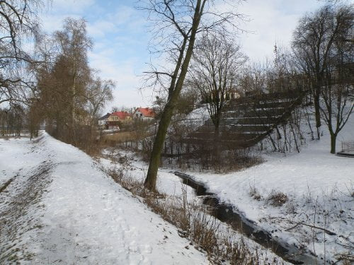 A tu widok od strony mostu na skarpę, po lewej stronie droga do Grzanki i na bazar