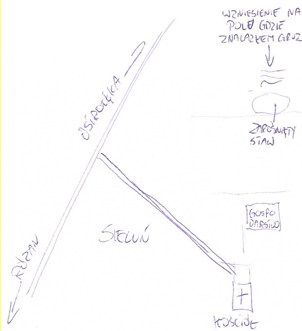 Narysowałem taki mniej więcej schematyczny planik lokalizacji dworu, drugie zdjęcie przedstawia wzgórze za stawem gdzie znalazłem gruz, widok jest od strony gospodarstwa, odległość gospodarstwa na planie do zarastającego stawu to mniej więcej długość boiska piłkarskiego. Oczywiście, nie uwzględniłem innych zabudowań tylko te istotne