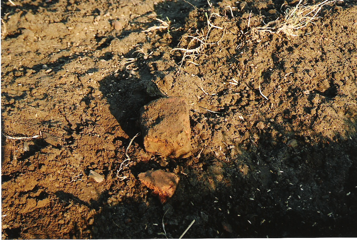Na zdjęciach miejsce po dworze, widok na teren gdzie stał dwór od strony dawnego stawu, znaleziony gruz ceglany i kawałki cegieł na zaoranym polu w miejscu dworu