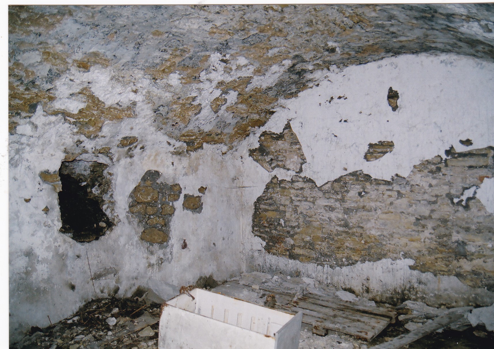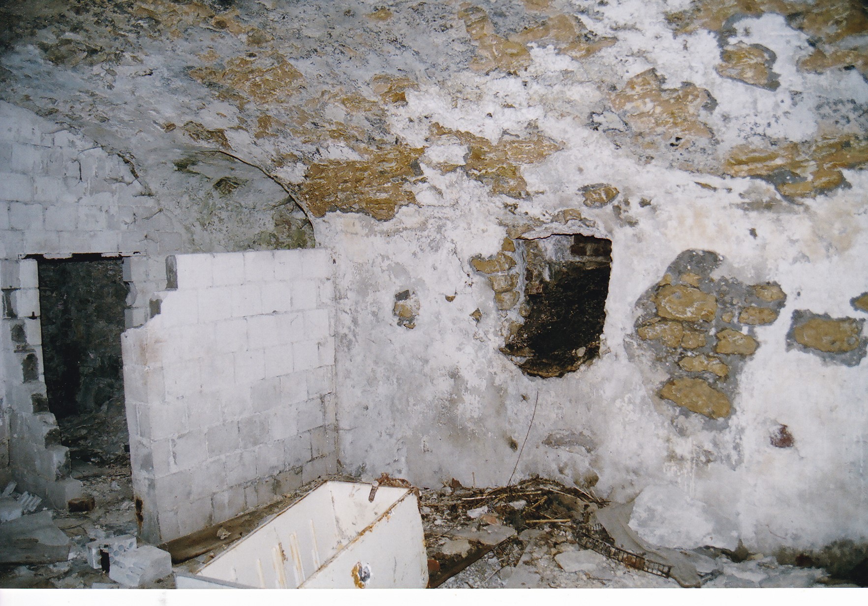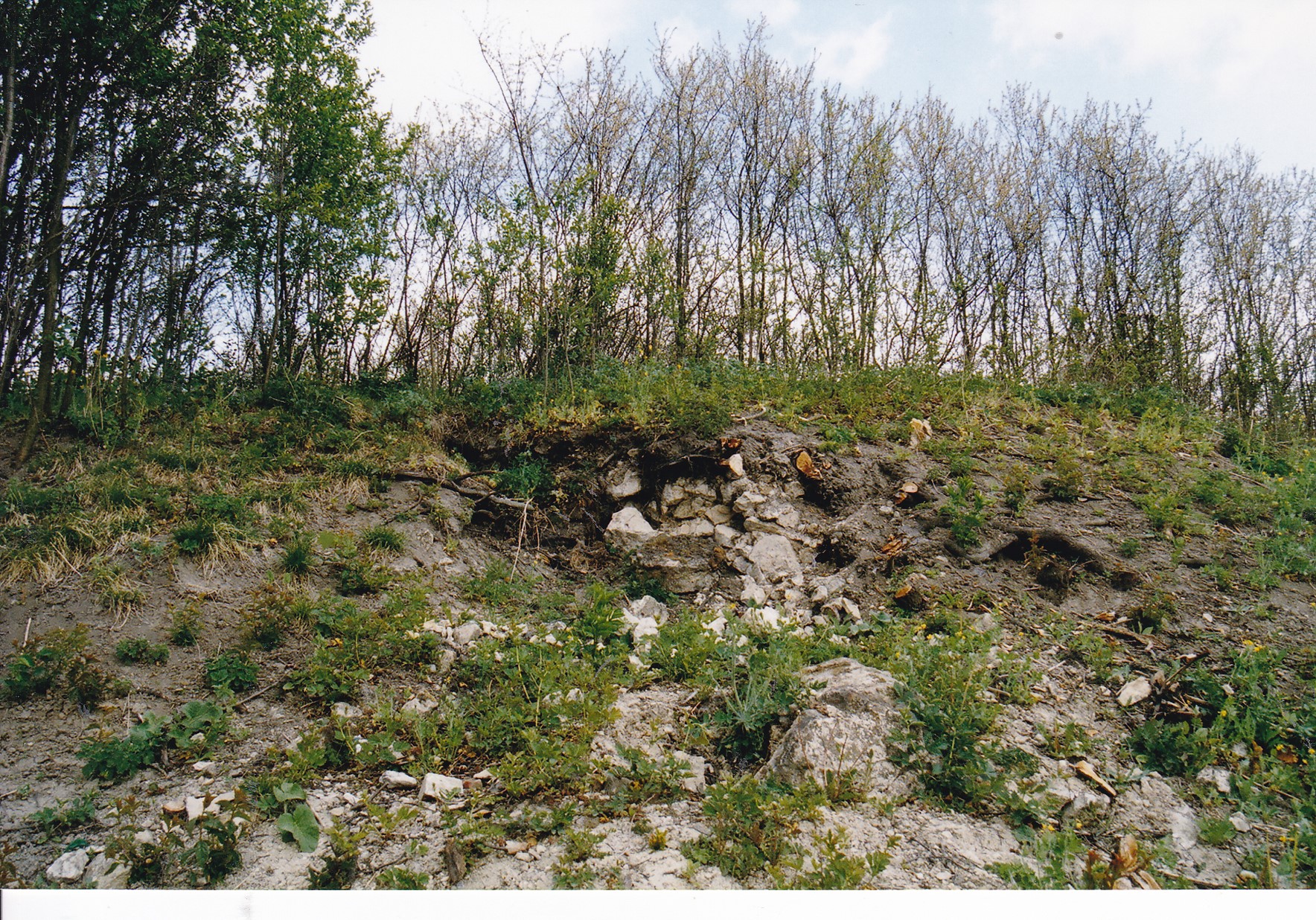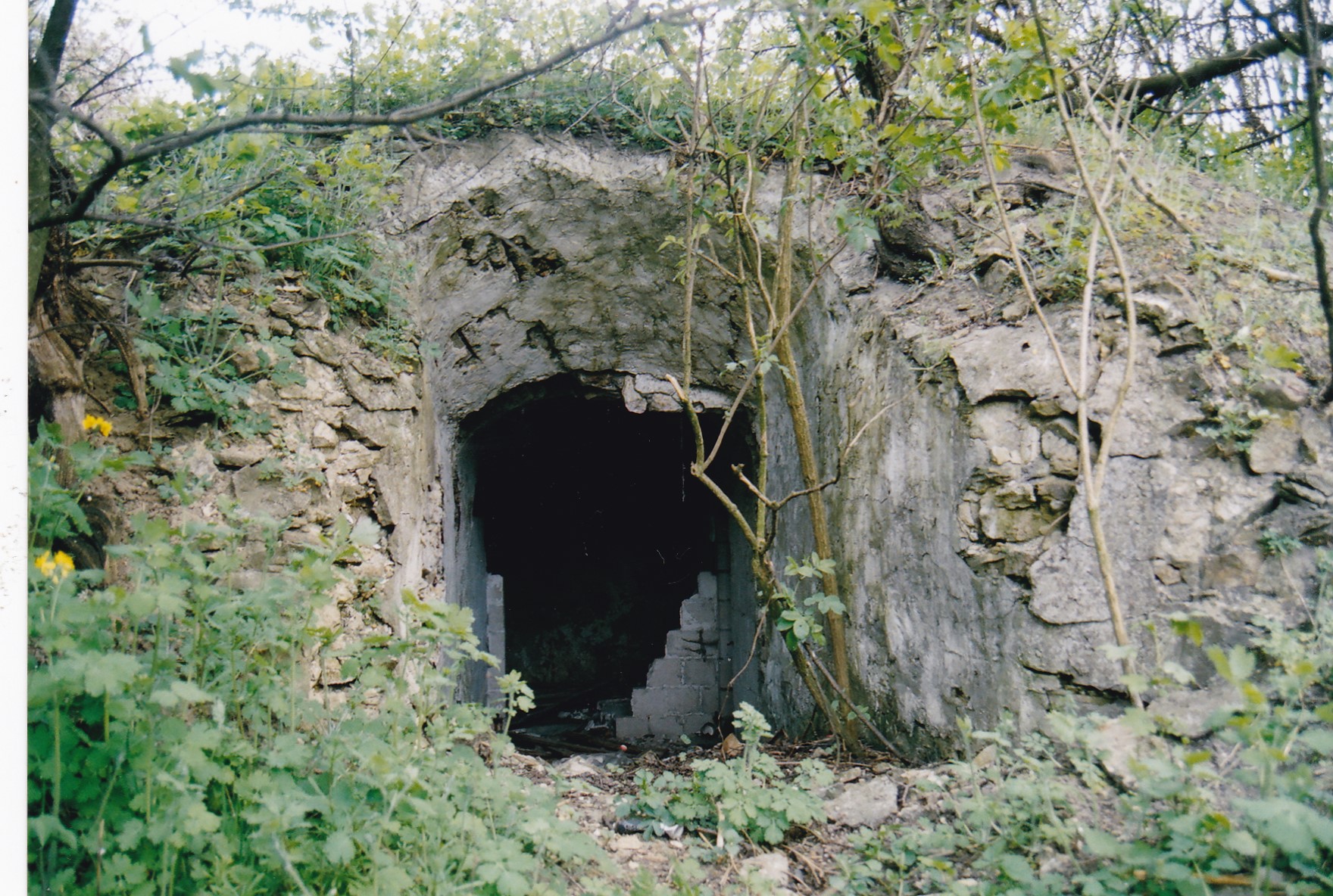 Na zdjęciach, kopiec otoczony fosą, ślady muru na zboczu kopca, wejście do piwnicy, piwnica