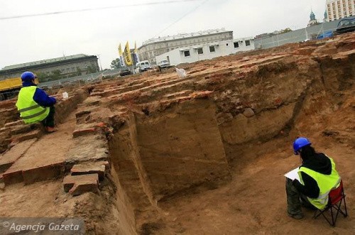 Wykopaliska przy pl. Piłsudskiego trwają już ponad miesiąc. Badacze przeszukują podziemia zburzonego przez Niemców pałacu. Ich praca poprzedza planowaną odbudowę gmachu. Do tej pory odsłonili istny labirynt piwnic. Ceglane mury z czasów saskich przeplatają się ze starszymi reliktami piwnic Morsztyna oraz ścianami z XIX w. Archeolodzy wyciągnęli z ziemi mnóstwo rozmaitych przedmiotów: naczyń, ozdobnych kafli, monet. Niedawno opisaliśmy odkrycie kompletu kamiennych płyt litograficznych z tekstami instrukcji i notatek mieszczącego się tu przed wojną Sztabu Generalnego Wojska Polskiego.