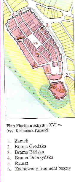 Oprócz nich były bramy. W "Monografii historycznej Płocka" arcybiskupa Nowowiejskiego z 1930 roku czytamy: (...) przy każdej bramie był most zwodzony, a nad nią - wieżyczka dla strażnika. Obok była waga pod dachem, wspartym na wysokich słupach. Bram miejskich było trzy: I-wsza, zwana grodzką, prowadziła od traktu czerwińskiego (...), znajdowała się w miejscu, gdzie się obecnie zaczyna ulica Kościuszki, obok odwachu (...). II-ga brama była bielska, tam gdzie obecnie róg ulicy Szerokiej (dziś Kwiatka) i Bielskiej wypada. III-cia brama dobrzyńska, obecnie na ulicy tej samej nazwy" (dziś w rejonie skrzyżowania Kazimierza Wielkiego z Okrzei).