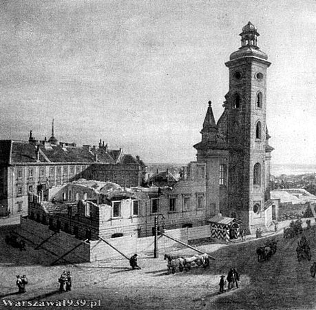 Widok na rozbierany kościół i przyległą kamienicę. W tle Zamek Królewski.