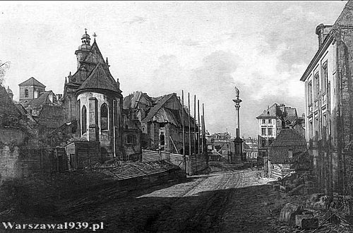 Od lewej: kamienica Camponiego, wieża kościoła św. Klary, poniżej fosa i fragmenty muru, powyżej odsłonięte w wyniku rozbiórki wnętrze kościoła z widokiem nawy, ale bez prezbiterium, którego już nie ma. Na pierwszym planie gruzowisko w miejscu zabudowań klasztornych. Po prawej skrzydło płd. Zamku Królewskiego.