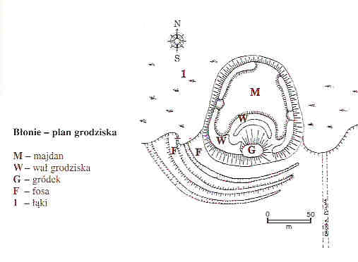 Obiekt w Błoniu po ostatnich badaniach jest zaliczany do zamków typu przejściowego czyli ogólnie mówiąc jest formą przejściową pomiędzy grodem, a zamkiem. Na wywyższonej, odciętej walem i fosą południowej części dwuczłonowego, pierścieniowatego grodziska znaleziono pozostałości budowlane, które zidentyfikowano jako pozostałości drewnianej wieży o funkcji refugialnej. W północnej części majdanu przy krawędzi wschodniej odkryto pozostałości budynku ceglanego - dworu/pałacu. Całość składała się z drewnianej wieży o funkcjach refugialnych oraz obszernego dziedzińca z murowanym pałacem otoczonym drewnianą zabudową pomocniczą i walami. |