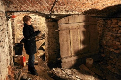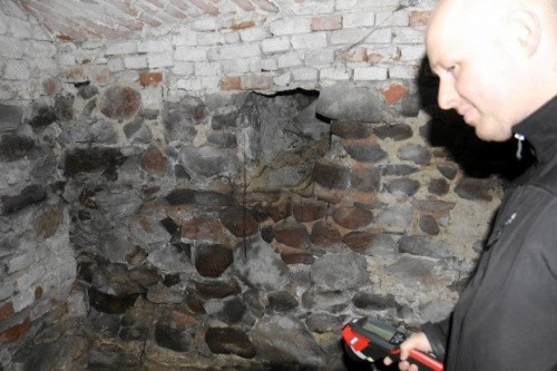 - Trafiliśmy po prostu na niezbyt sprzyjającą nam pogodę. Różnica temperatur pomiędzy tą panującą wewnątrz budynku a tą na zewnątrz, jest zbyt mała, aby urządzenie wykryło anomalie - wyjaśnia Kowalczyk. Postanawiamy jednakże zajrzeć do piwnic. Schodzimy po wąskich i stromych schodkach. Witają nas stare sklepienia i pajęczyny w licznych zakamarkach. Problemem jest brak oświetlenia. Sławicki ciągnie lampkę zasilaną długim kablem. Kowalczyk pilnie przygląda się ścianom. Ale te także skrzętnie chowają swoje tajemnice. Kamera nie pokazuje niczego ponad to, co widzimy gołym okiem. A oglądamy wnętrza piwnic odkopane i zbadane przez archeologów w latach 1999-2001. Tyle że to tylko cześć podziemi. Pozostała jest nadal zagruzowana, nie wiadomo też, gdzie znajduje się do niej wejście. Na jego odnalezienie liczyli społecznicy. Badania kamerą jednak kończą się niepowodzeniem. Znajdujemy za to kawałek zdobionego kafla piecowego.