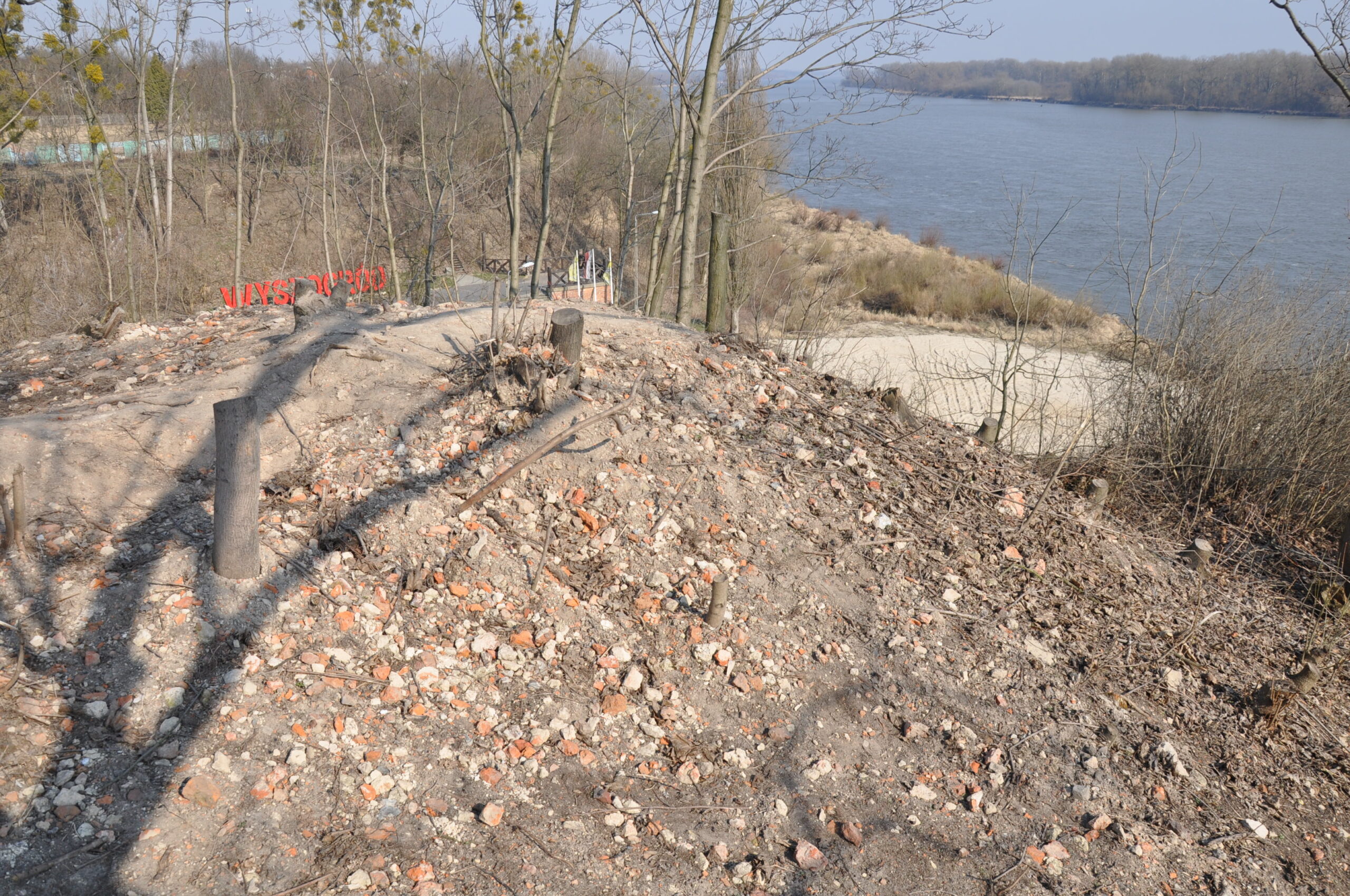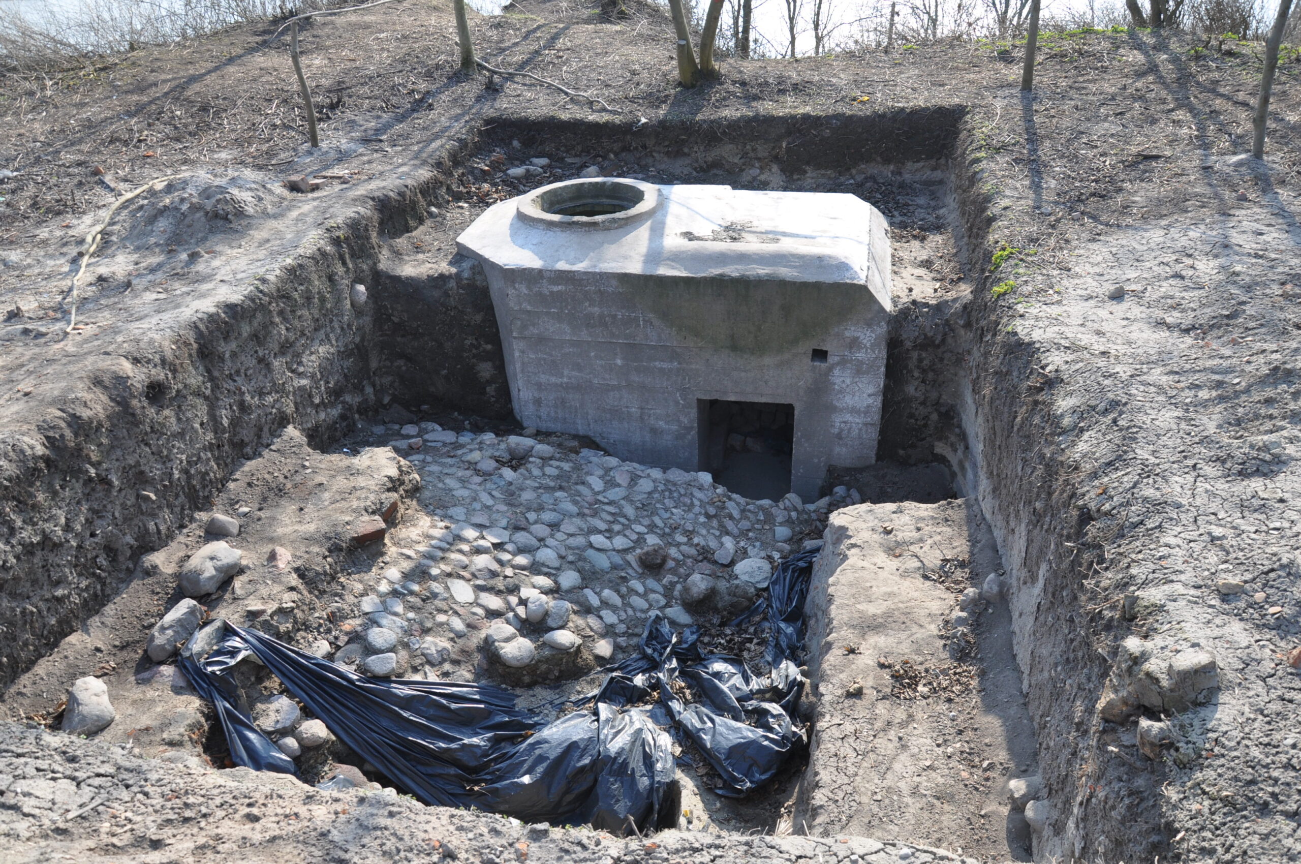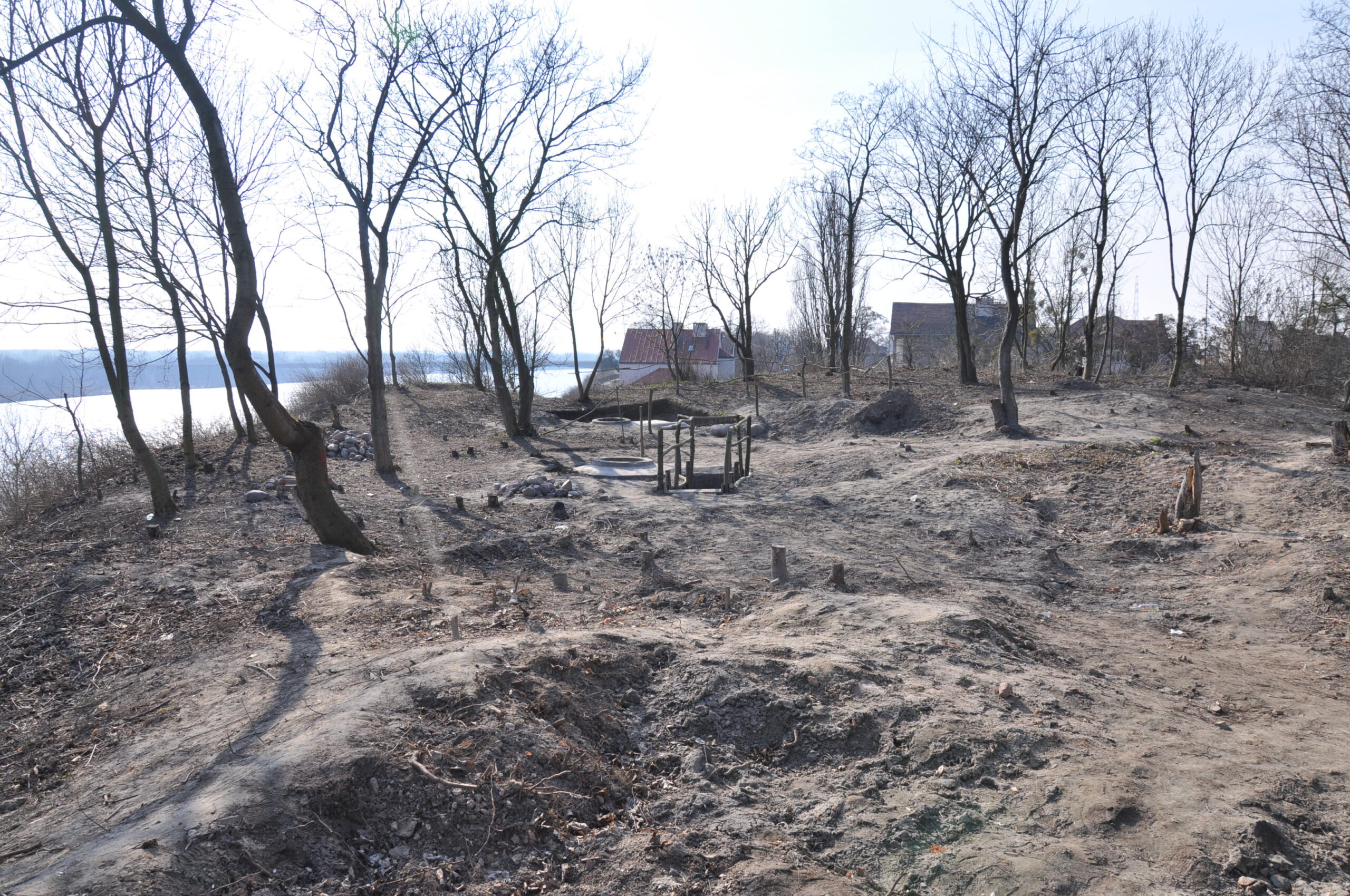 na wzgórzu, widać, że coś się dzieje, teren wykarczowany, wyeksponowane dwa bunkry