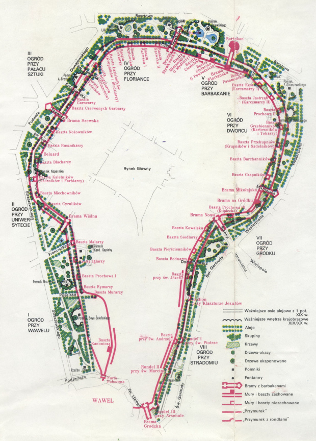 6. Atrapy - czyli współczesne murki na Plantach - nie mają nic wspólnego z zabytkami, co najwyżej spełniają funkcje poglądowe. Tytułem przykładu Baszta Mieczników i tzw. Rondel III