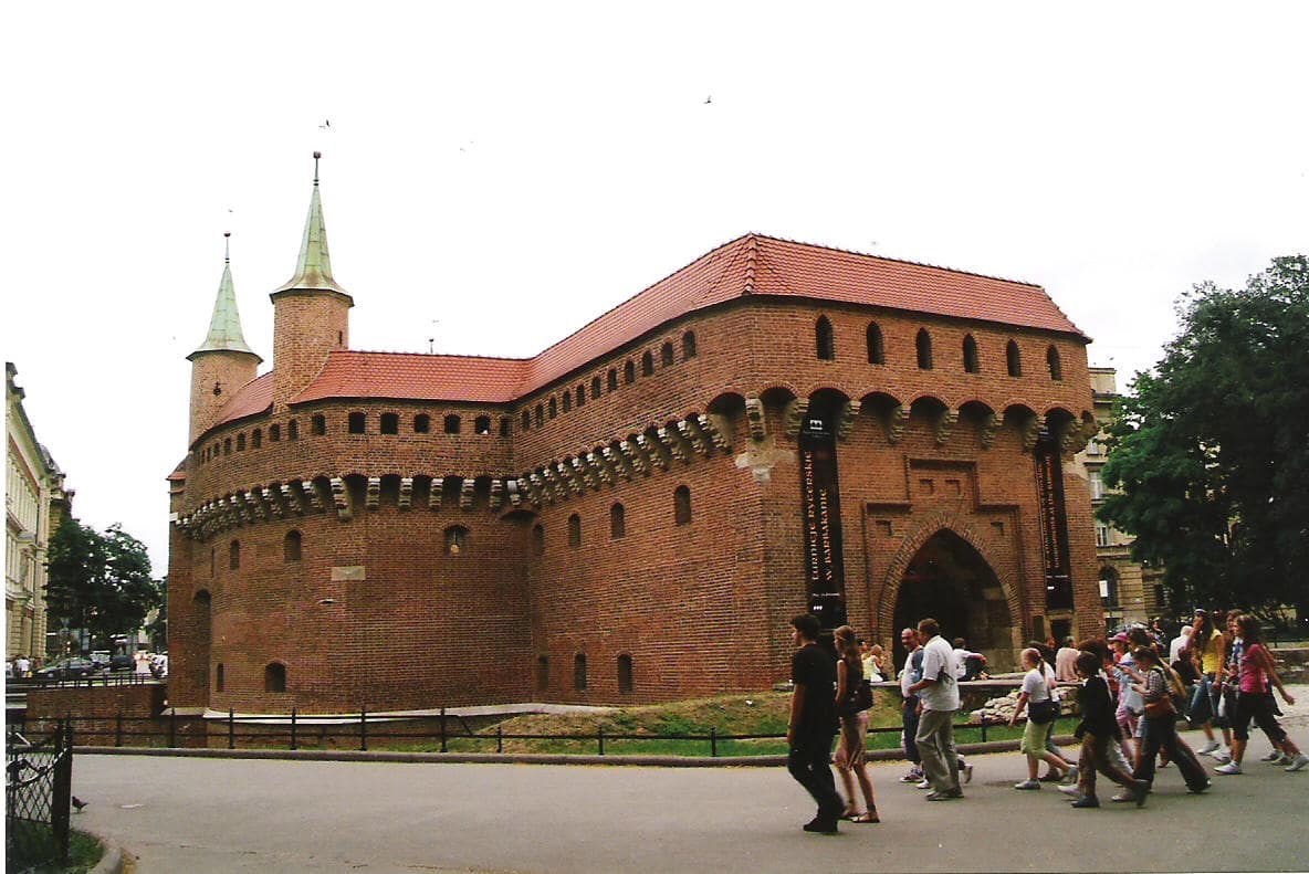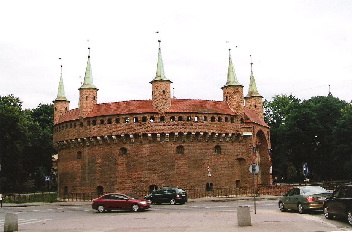 Największy spośród trzech tego typu gotyckich budynków fortyfikacyjnych, jakie zachowały się dotąd w Europie, został wzniesiony w latach 1498-1499 wobec grożącego Polsce niebezpieczeństwa najazdu turecko – tatarskiego. Był wówczas najdoskonalszym osiągnięciem inżynierii wojskowej; w razie potrzeby prowadził ostrzał ze 130 strzelnic, a potężne, trzymetrowej grubości mury chroniły go od kul armatnich. Siedem wieżyczek obserwacyjnych pozwalało śledzić ruchy nieprzyjaciela i odpowiednio nakierować ogień. Wjazd do tej fortecy prowadził przez most zwodzony, przerzucony nad głęboką, szeroką na 8 metrów fosą. Barbakan połączony był ongiś z Bramą Floriańską tzw. Szyją – podwójnym potężnym murem obronnym z drogą przejazdową pośrodku. Cały ten zespół fortyfikacyjny wraz z arsenałem, otoczony murami, wałami i fosami stanowił dla wroga zaporę prawie nie do przebycia. Jedynie podczas oblężenia Krakowa przez Szwedów w 1655 roku załoga barbakanu skapitulowała z powodu braku amunicji i panującego pośród niej głodu.