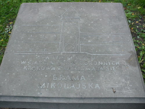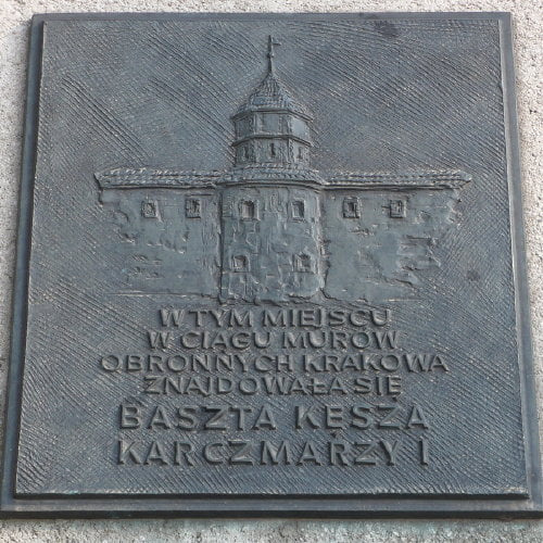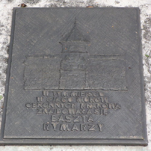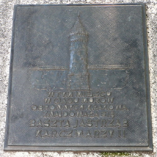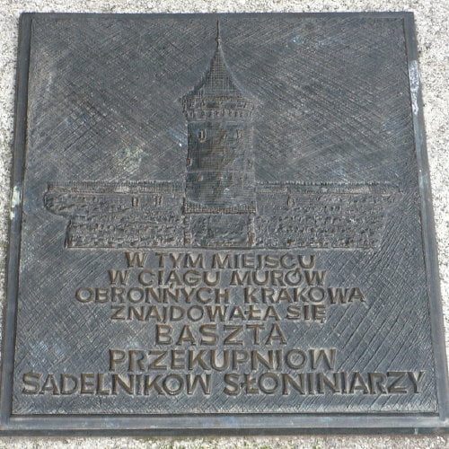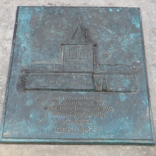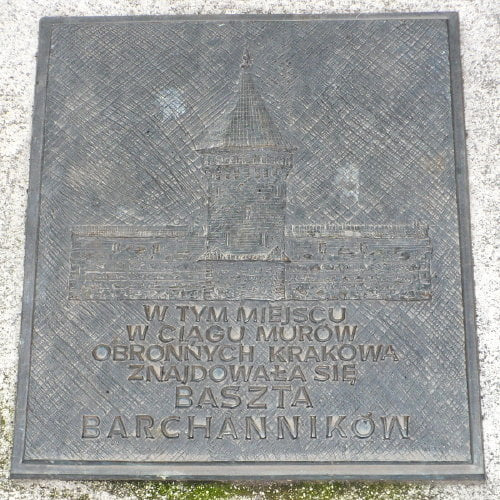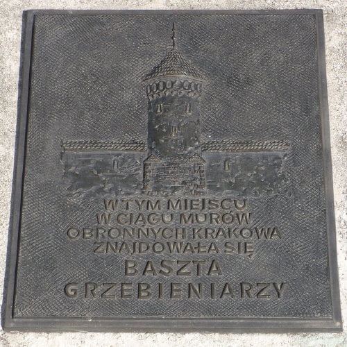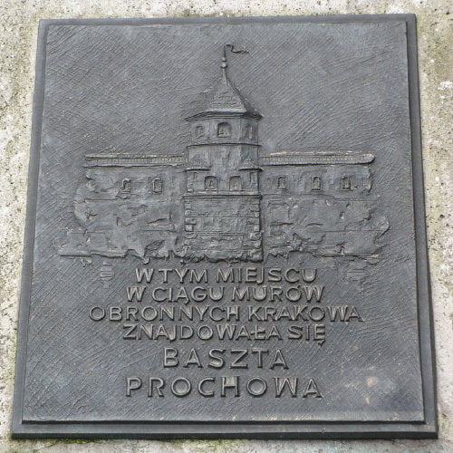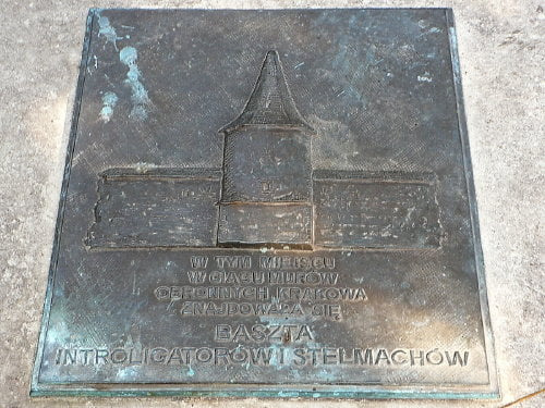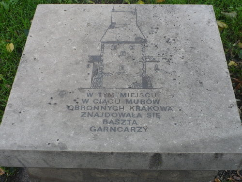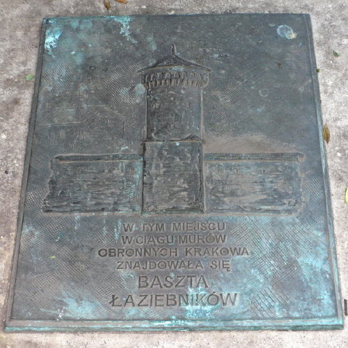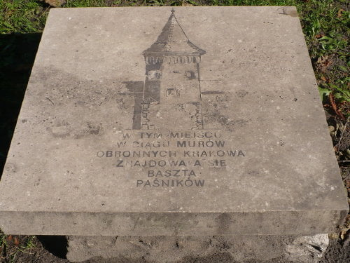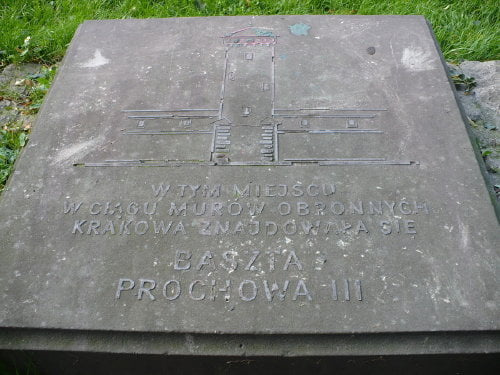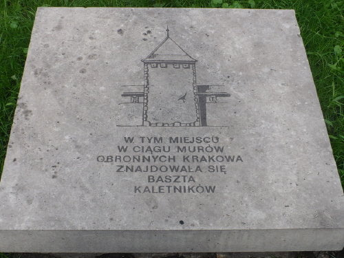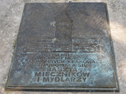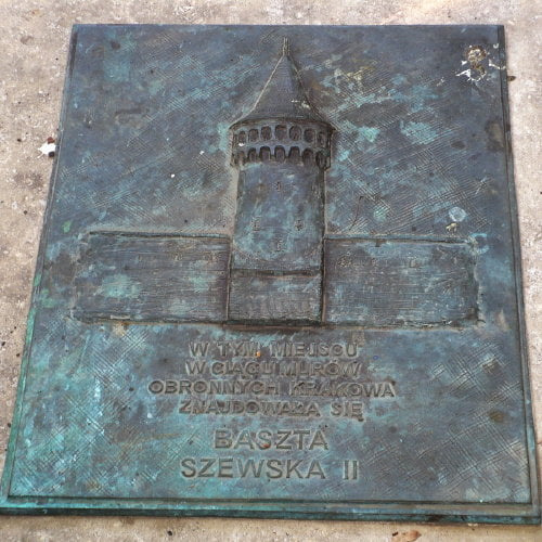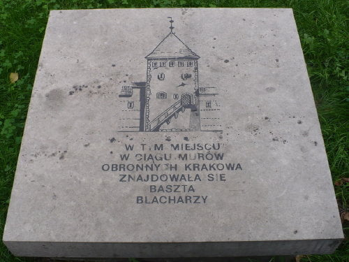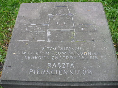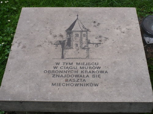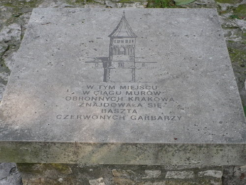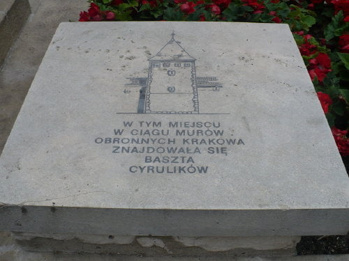 W trakcie wklejania wynikła pewna niejasność. Na planie murów nie ma baszty Kurdybaników, która ma swój cokół na Plantach. Znajduje się między Bramą Na Gródku a Basztą Prochową III.