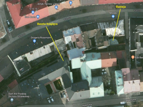 Dodaję nie swoje zdjęcie Baszty Książęcej z innej perspektywy - znalezione w internecie, źródła niestety nie pamiętam. Oraz zrzut z Google Maps (podobno 2019 r.) - dla poszukiwaczy baszty. Wbrew temu, co napisałem wyżej, baszta jest w rzucie prawdopodobnie okrągła (a nie półokrągła), i chyba na prostokątnej podstawie (?). Niestety z dołu tego nie widać. Jest to jeden z lepiej "schowanych" zabytków obronnych w naszym kraju.