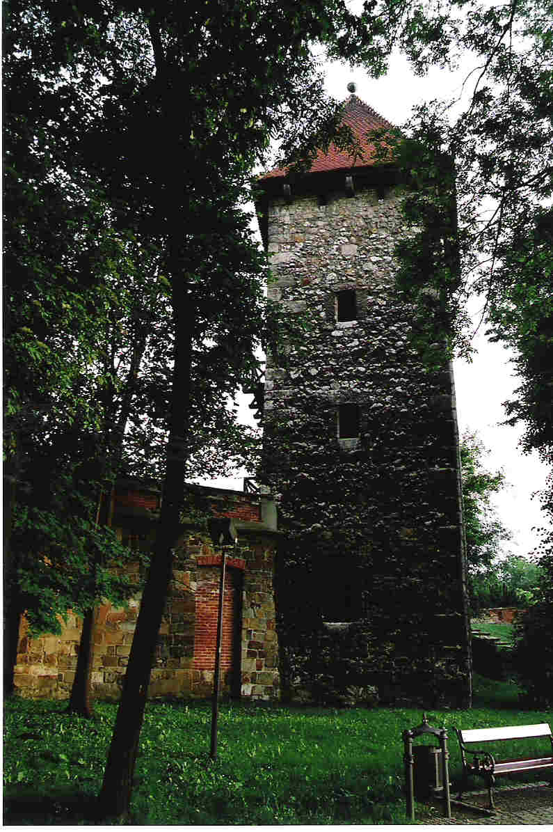 Spośród 21 baszt, które otaczały miasto zachowała się tylko narożna baszta przy zamku. Zbudowana została na planie zbliżonym do kwadratu i miała wysokość 11m od wewnątrz, a 16 od zewnątrz. Baszta miała 4 kondygnacje.